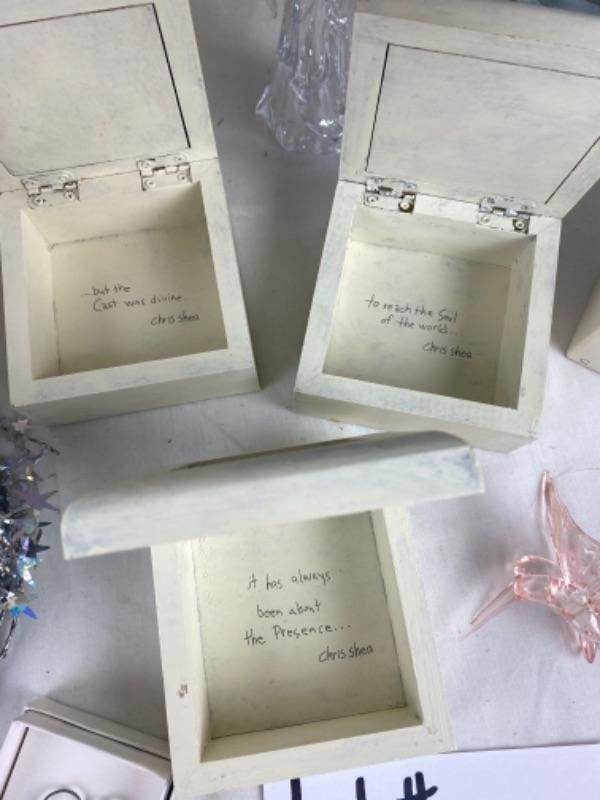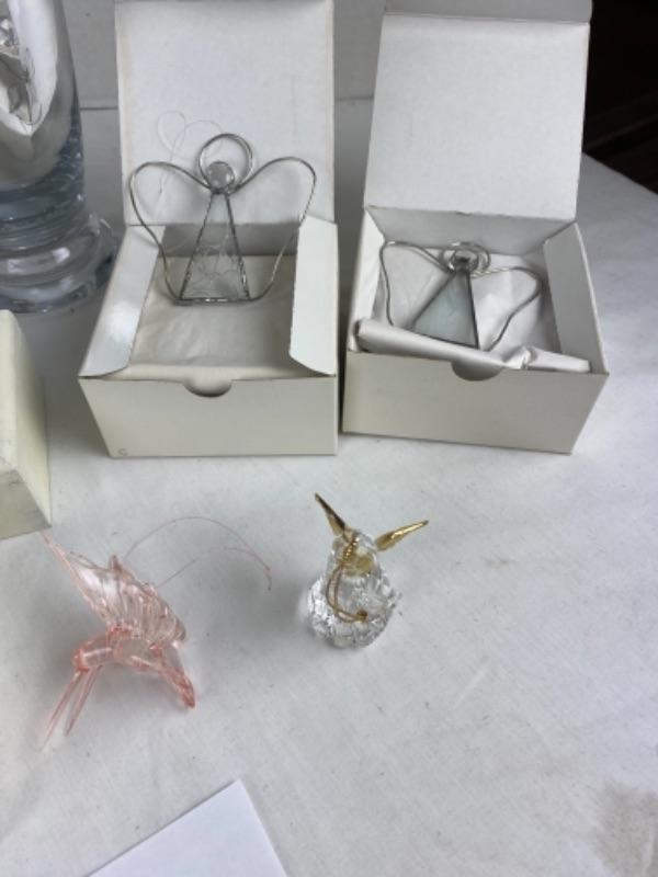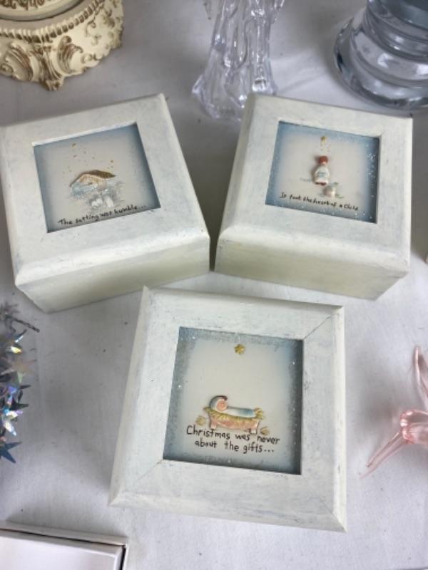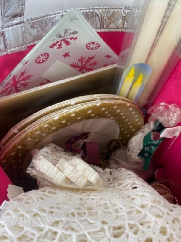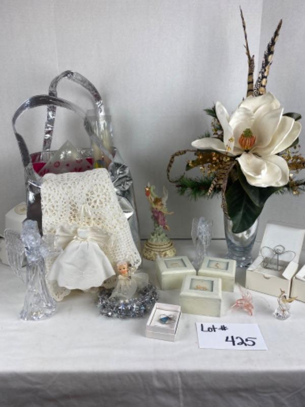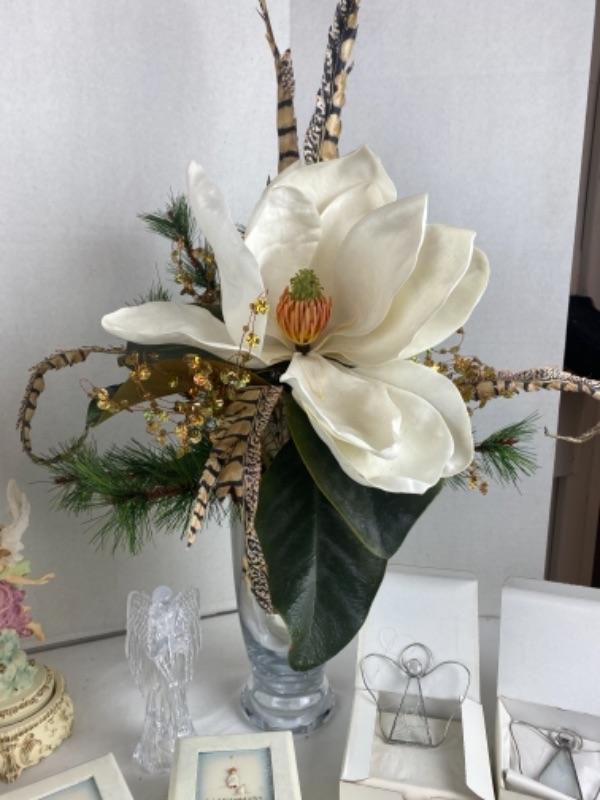 Silk magnolia floral arrangement with Angel Decor, paper products, glass snowflake plate, soaps, tablecloth, ornaments , decorative boxes