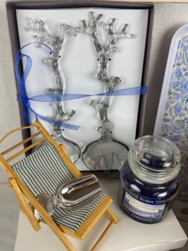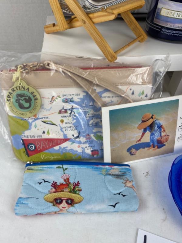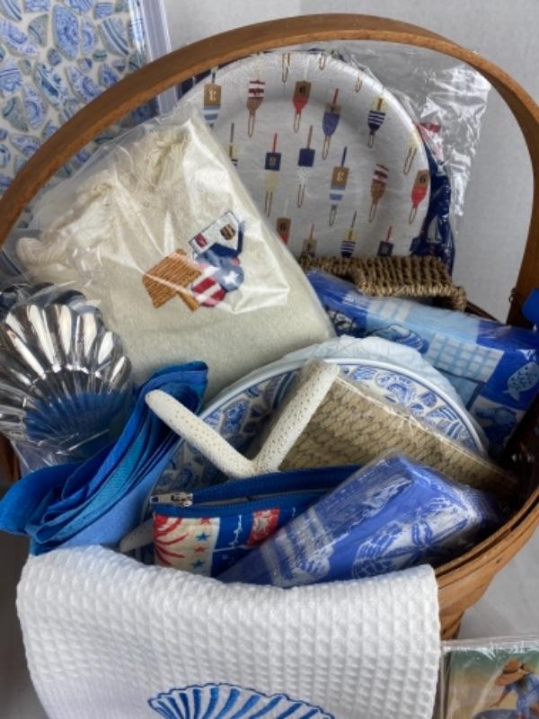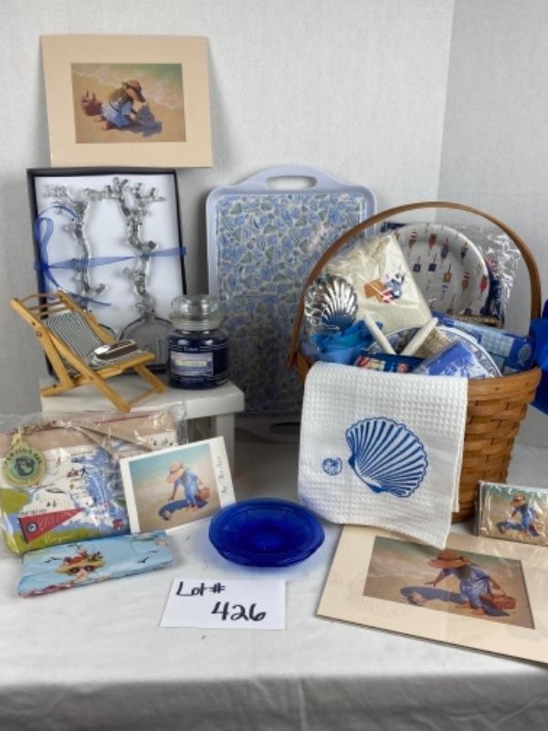 Spartina clutch, longaberger basket, paper plates, napkin holder, Schelle melamine tray, Hallmark blue and white plates, dish towels, Longaberger Framed girl on beach picture, Yankee candle, and much more
