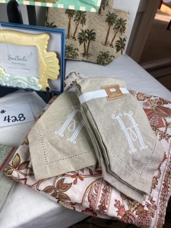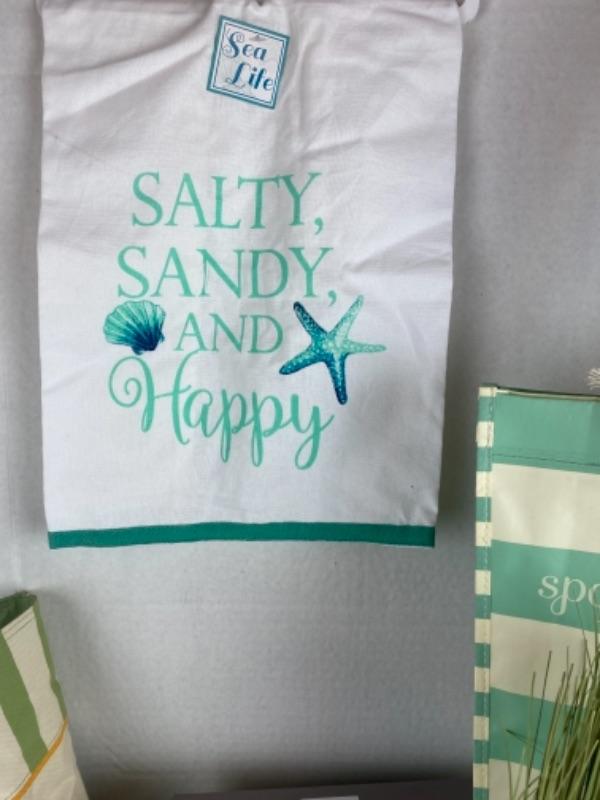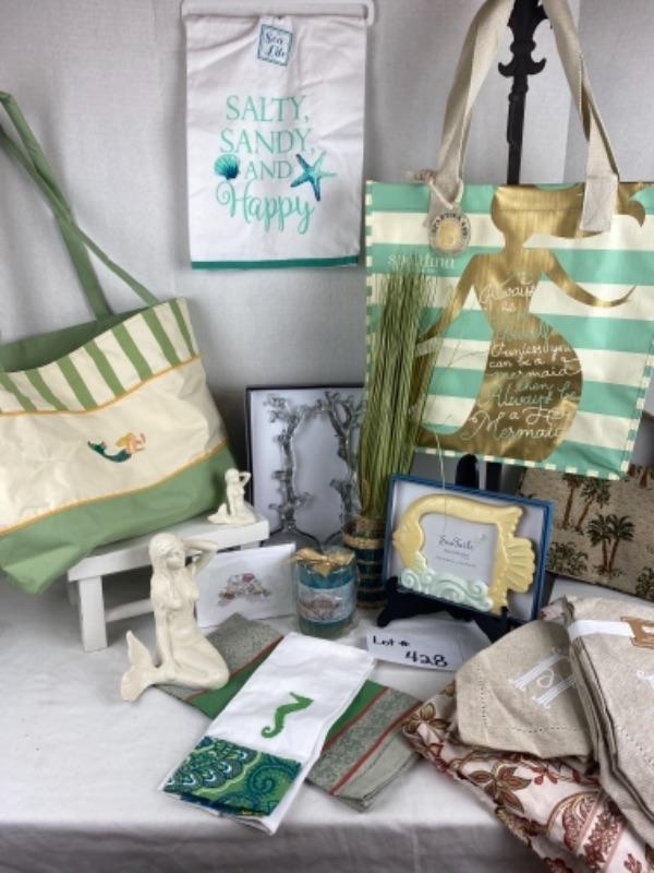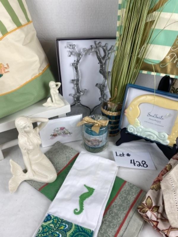 Mermaid gift bag with beach tea towel spartina tote, sea tails fish frame by reed and Barton, candles, iron mermaid Decour, April Cornell tablecloth with mud pie napkins, and much more
