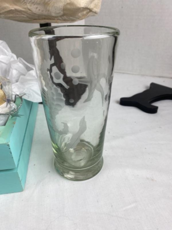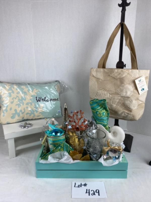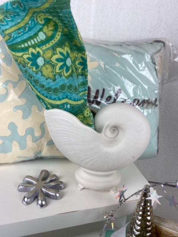 Mariposa seahorse ice tea glasses (4) with welcome pillow, candles, silk scarf ,Mercury trees, April Cornell napkins , Margaret furlong nautilus shell