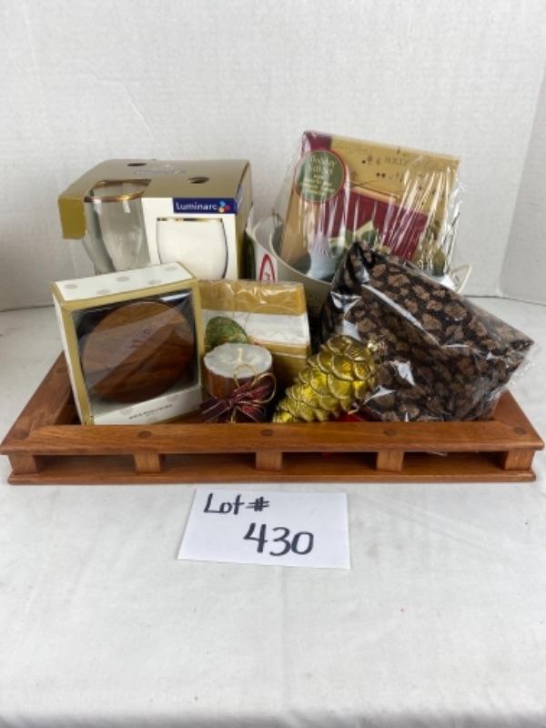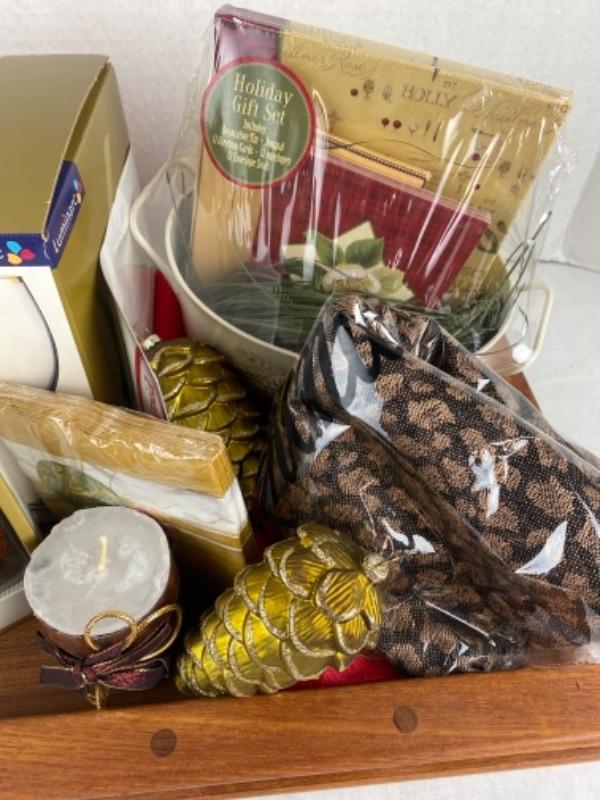 Wooden Dansk tray with coasters, set of four gold rim wine glasses, candle, poshMina scarf, holiday gift writing set, two Pine Cone Ornaments,