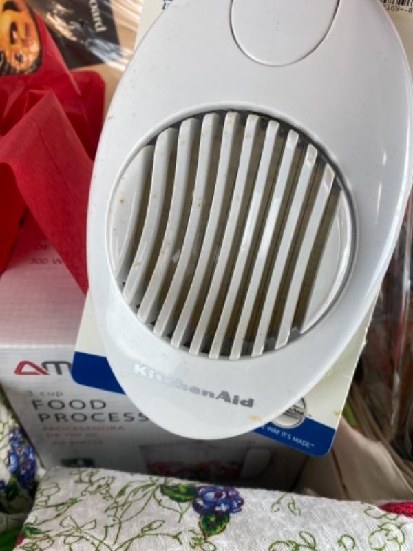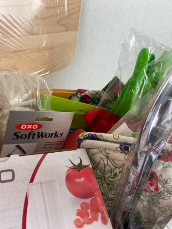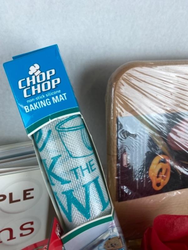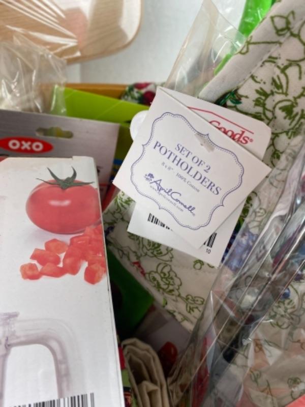 Laura Ashley Housel gloves chops silicone baking mat, wooden cutting board, three cat food processor, watermelon slicer, April Coronao dish towels and potholders, scrub brushes, cherry pitter, aprons, tea towels, French knives, cookbooks, and much more