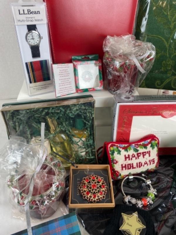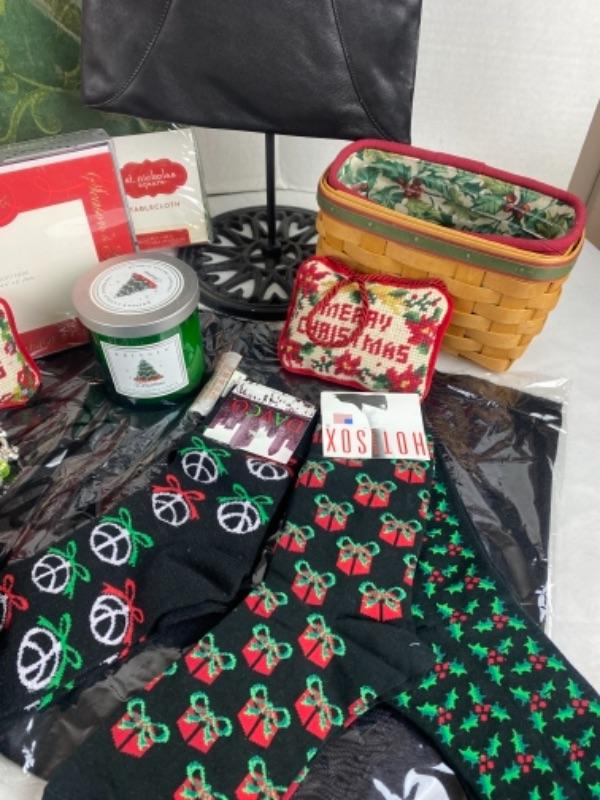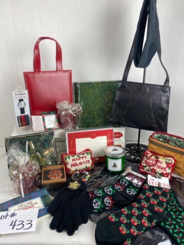 Red and black leather handbags with candles, greeting cards, tablecloth, longaberger basket, Kringle Christmas candle, Christmas socks, black pashMina scarf, Monet jewelry, bath oil’s and lotion, LL Bean watch