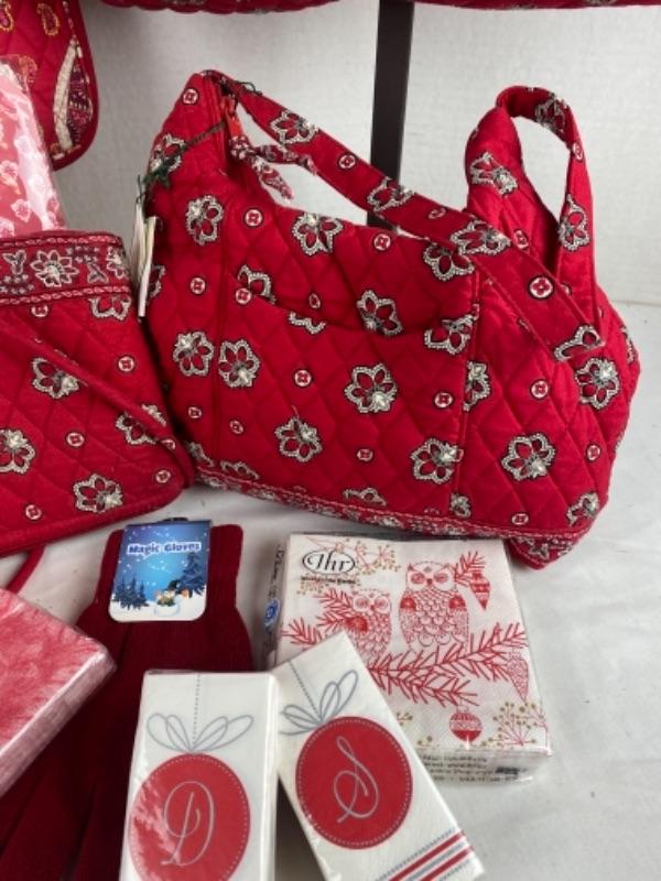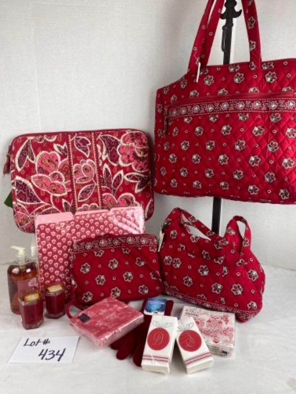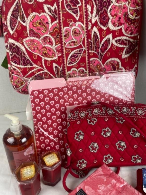 Read vera Bradley three-piece gift lot in classic Red, 17 inch laptop sleeve in the pattern Rosie Posey “˜s, hand soap, candles, file folders and red and black totes umbrella, napkins, gloves