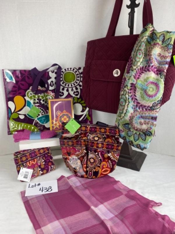 Vera Bradley raisin tote with safari sunset tote, and apron, spartina Scarf, Tom at scarf, socks, hand soap, and much more