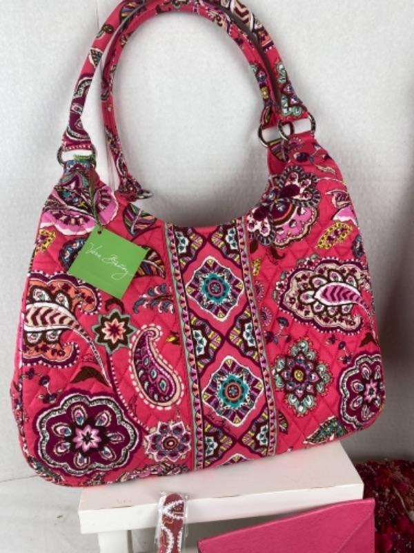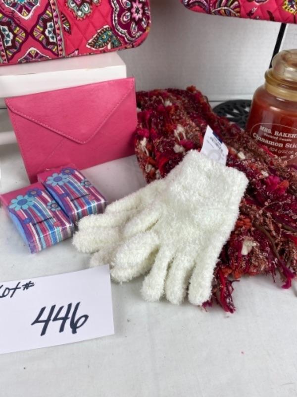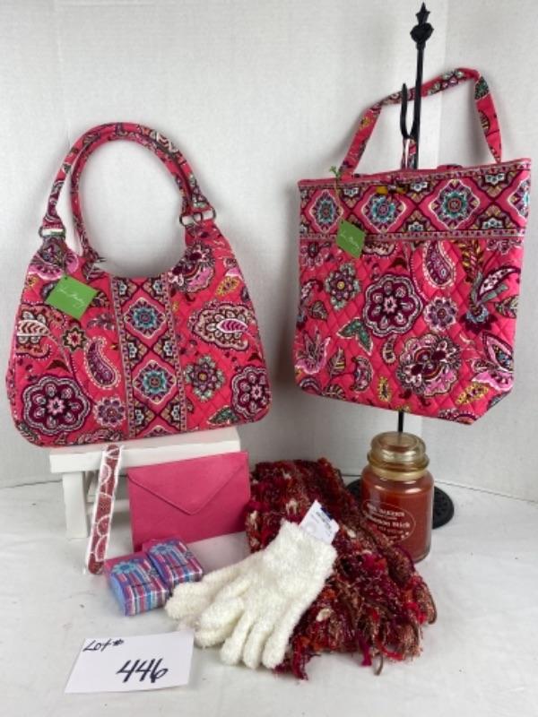 Vera Bradley call me coral Handbag lot with gloves, scarf, candle, tissues,