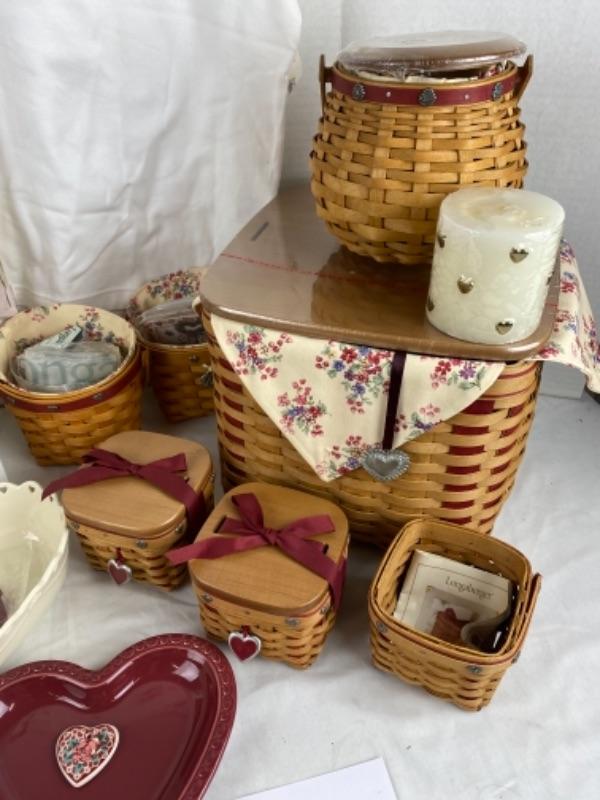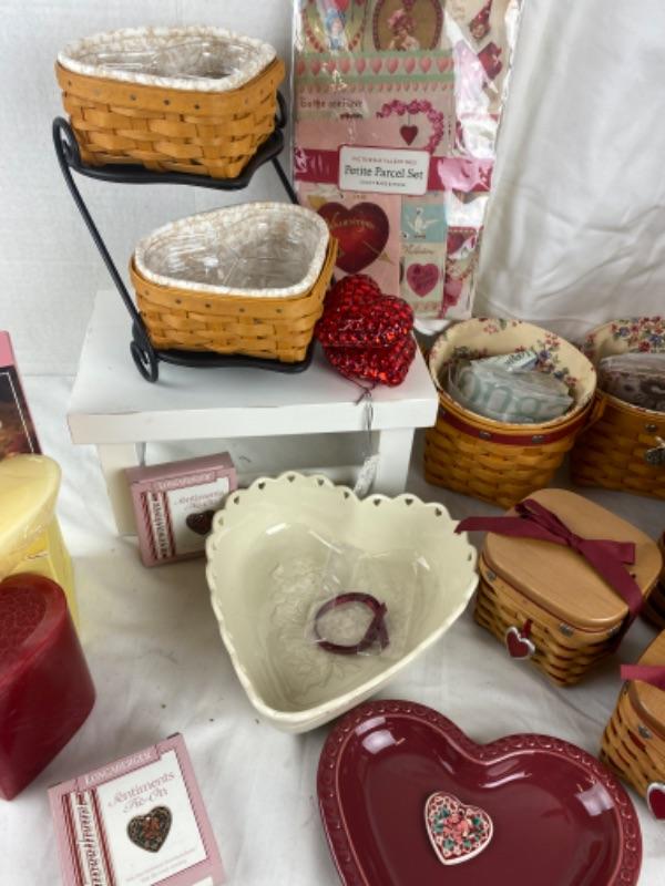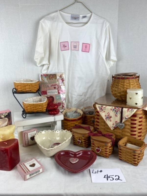 Longaberger Sweetheart basket set with Victorian valentines, heart shaped candles, heart shaped Pottery plate, heart shaped bowl, heart ornaments Longaberger Hope Shirt size xl and much more