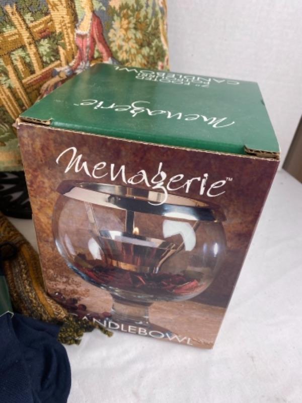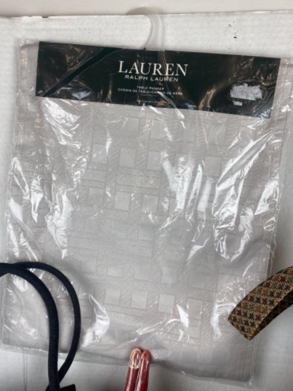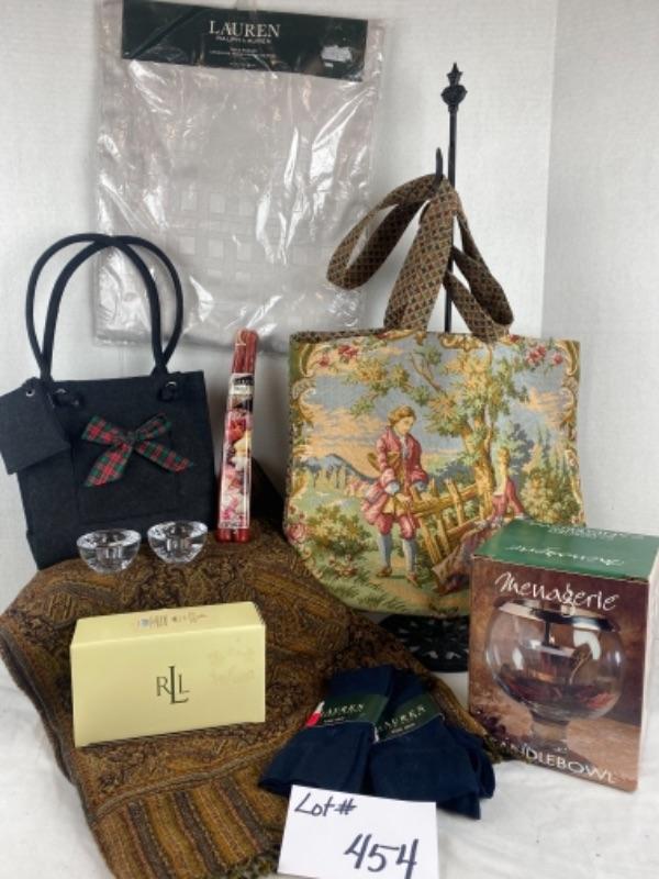 Ralph Lauren gift set with candle holder in the pattern Hewitt, Yankee candles, Ralph Lauren table runner, candle bowl, tapestry bag, will bag, scarf in Paisley design, Ralph Lauren knee-high socks