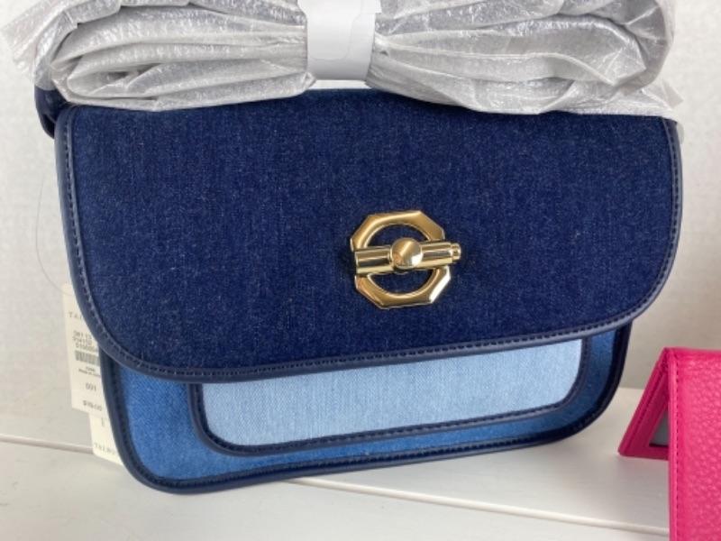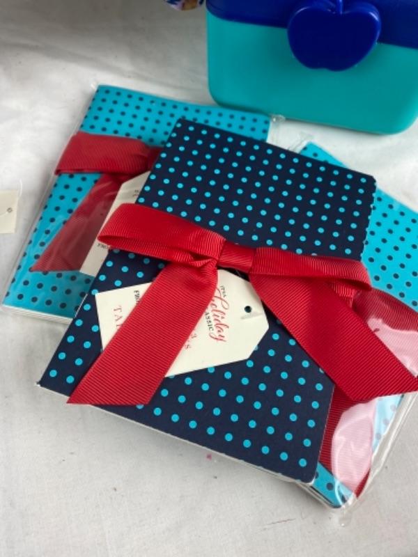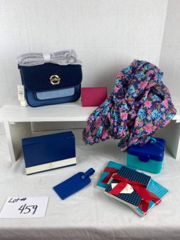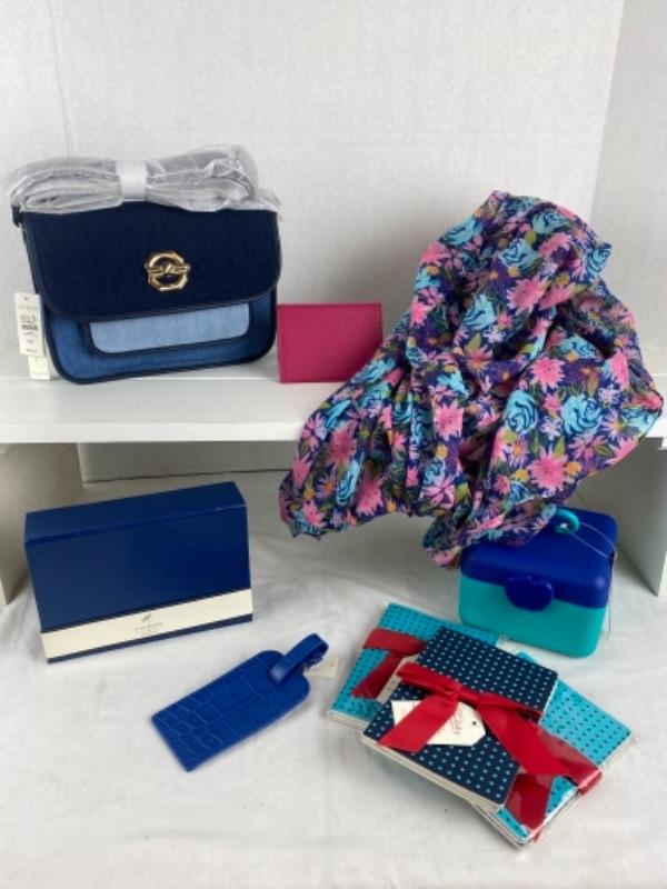 New Talbots denim Handbag with Leather pink wallet, scarf, Talbots holiday set of three notebooks, luggage tag, Talbots Crane writing paper