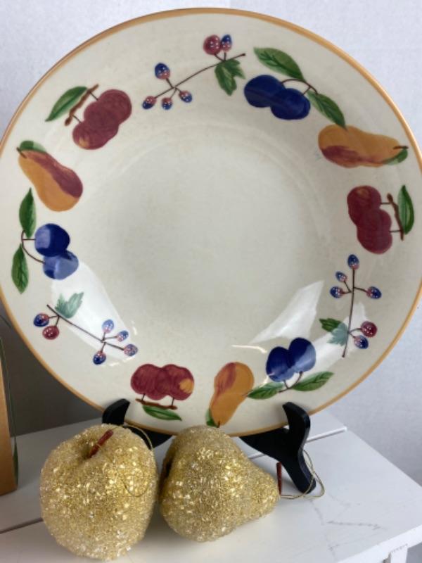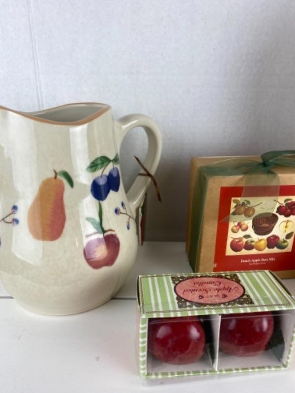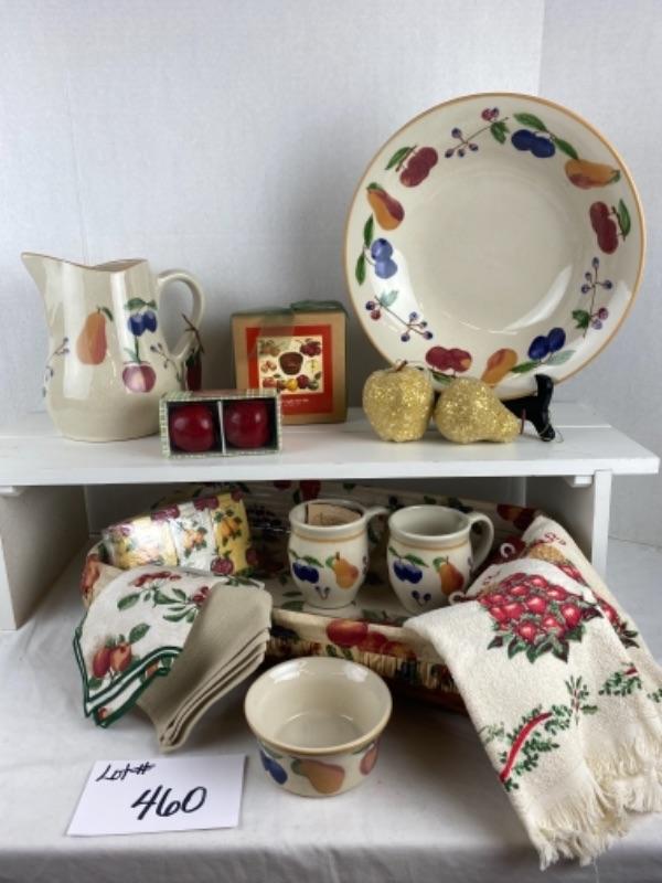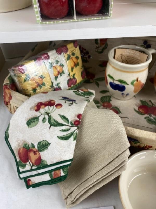 Longaberger Fruit Medley Picture pair of mugs, Pasta Bowl, apple bars mix, apple candles, apple and pear ornaments, large long and burger basket, kitchen towel set and much more