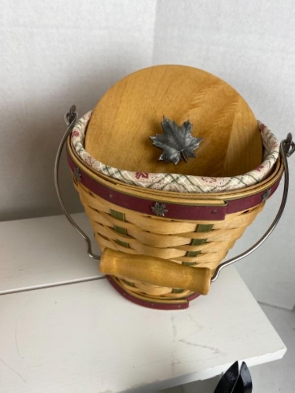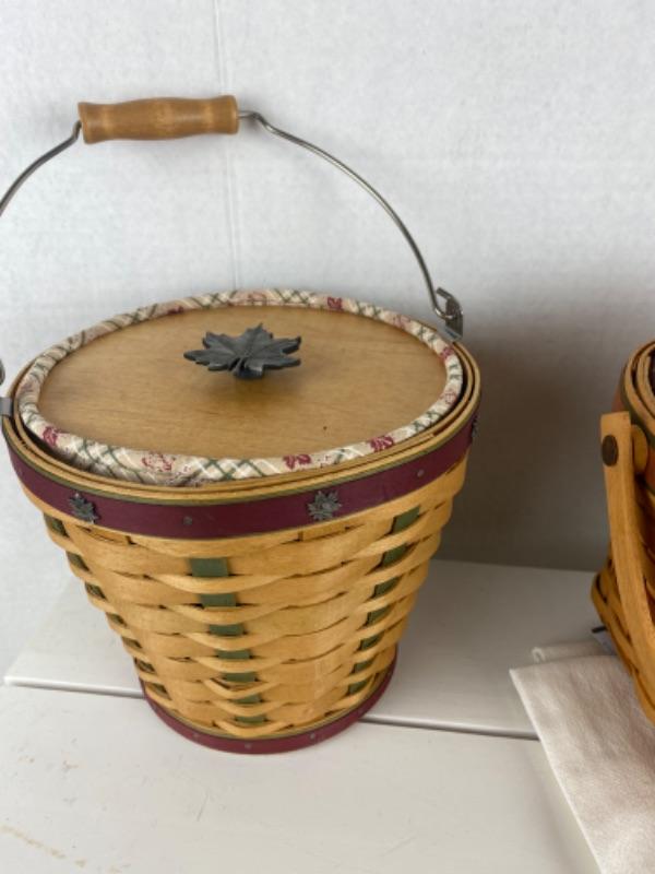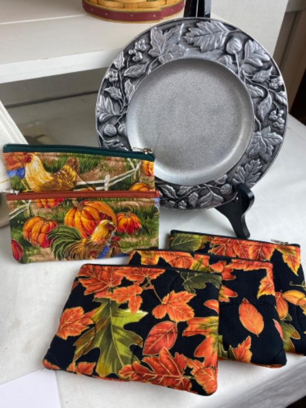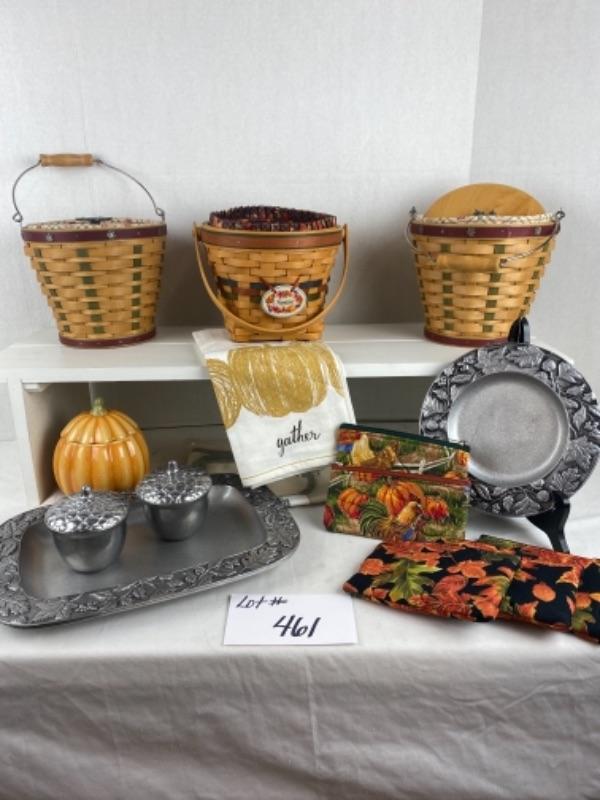 Longaberger Pewter Gift baskets with power tray and plate , maple leaf knob lids, gather tea towels, apron, pumpkin porcelain candle, hen and fall leaves zipper bags