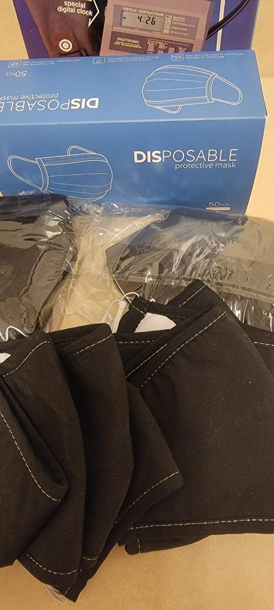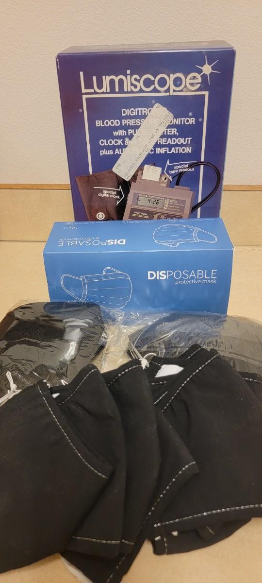Digital blood pressure monitor plus various protective masks.