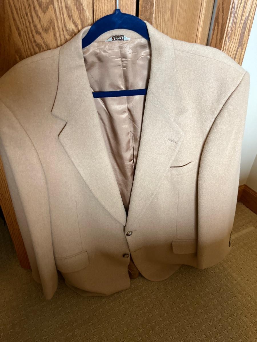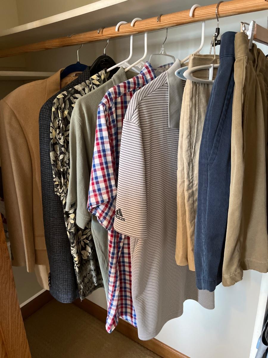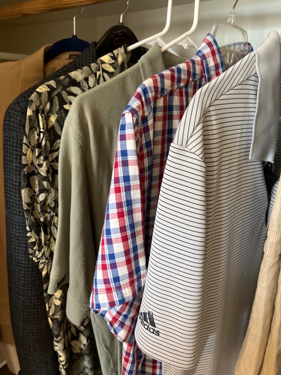 Shorts sz 36 (2 TBahama & Tori Richards), shirts M, L & Xxl. Jackets appear to be 42R