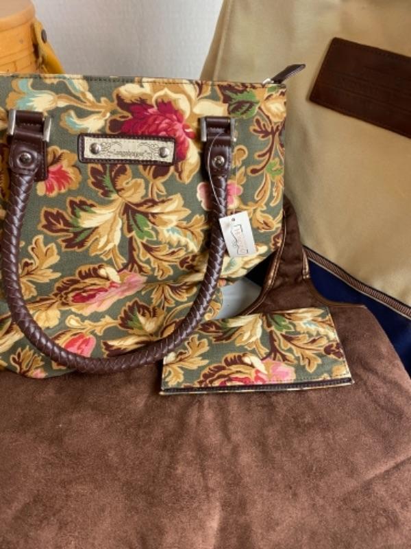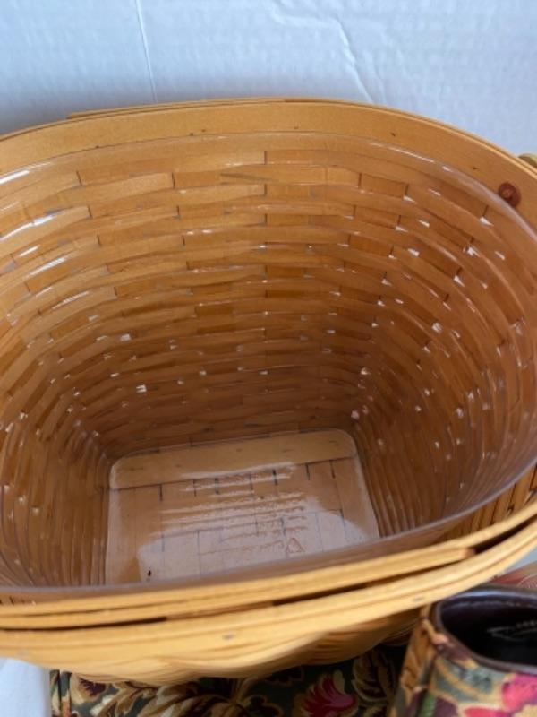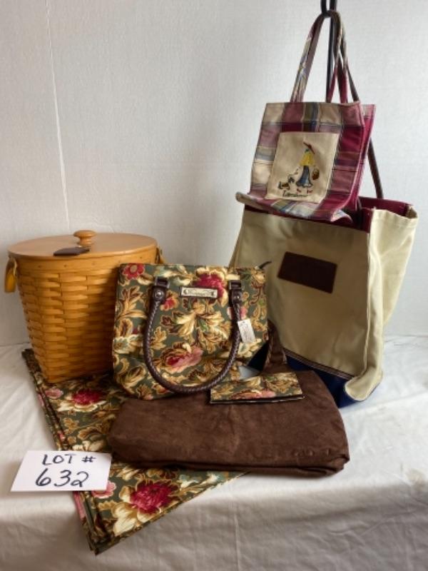Longaberger Purse lot with large Longaberger fabric Table Square, Small waste basket with leather keychain checkbook cover and much more