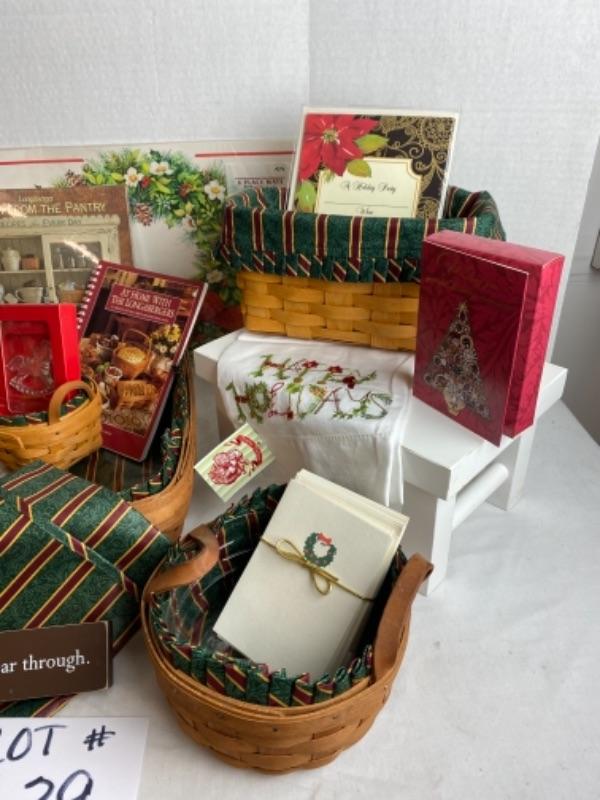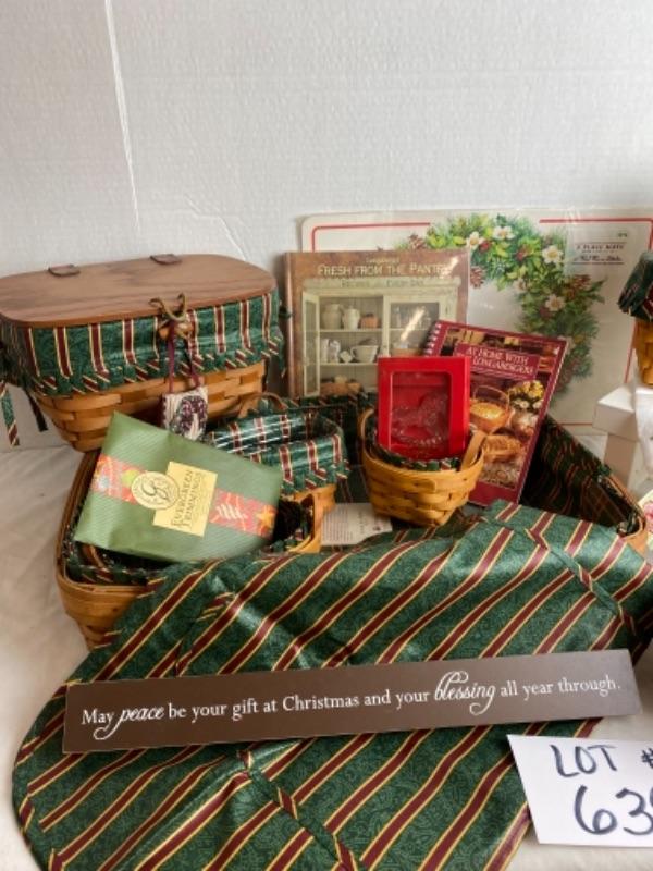 Longaberger 7 pc Imperial stripe basket set with two books, holiday invitations, tea towels , Gotham glass ornament, apron , placemats