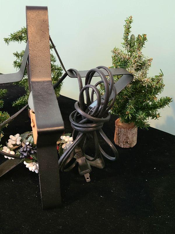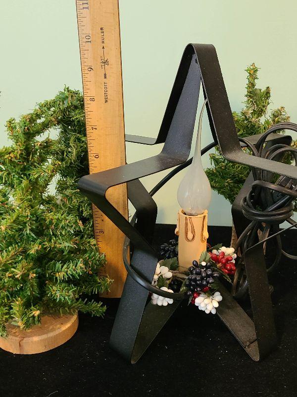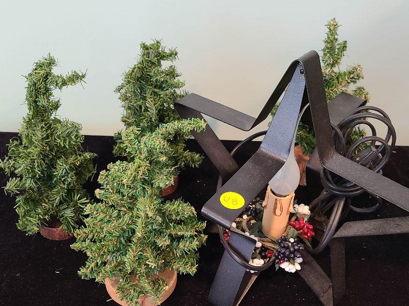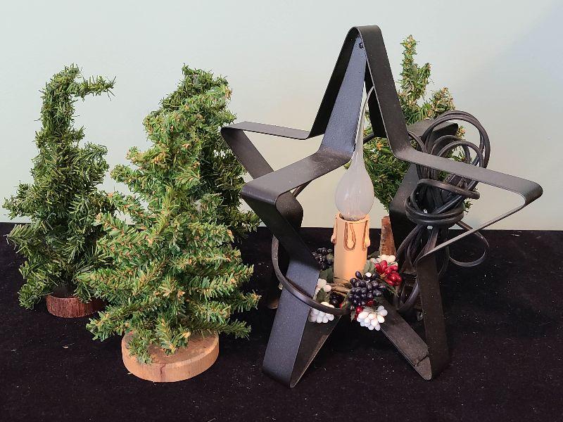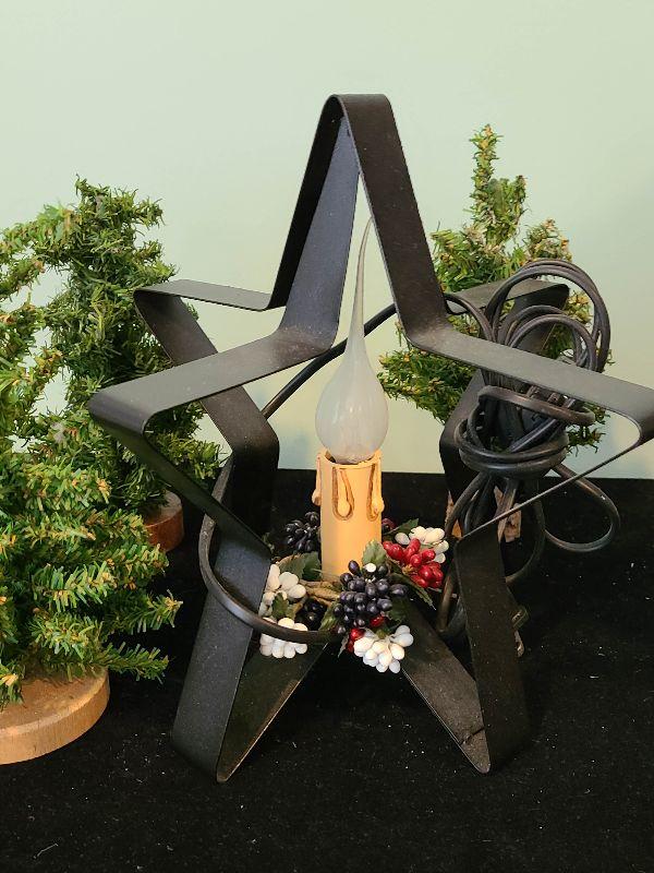 Metal Star with electric candle and tree décor. Please see pictures for contents of the lot, condition of the lot, and any measurements of the item. Thank you for looking and happy bidding!
