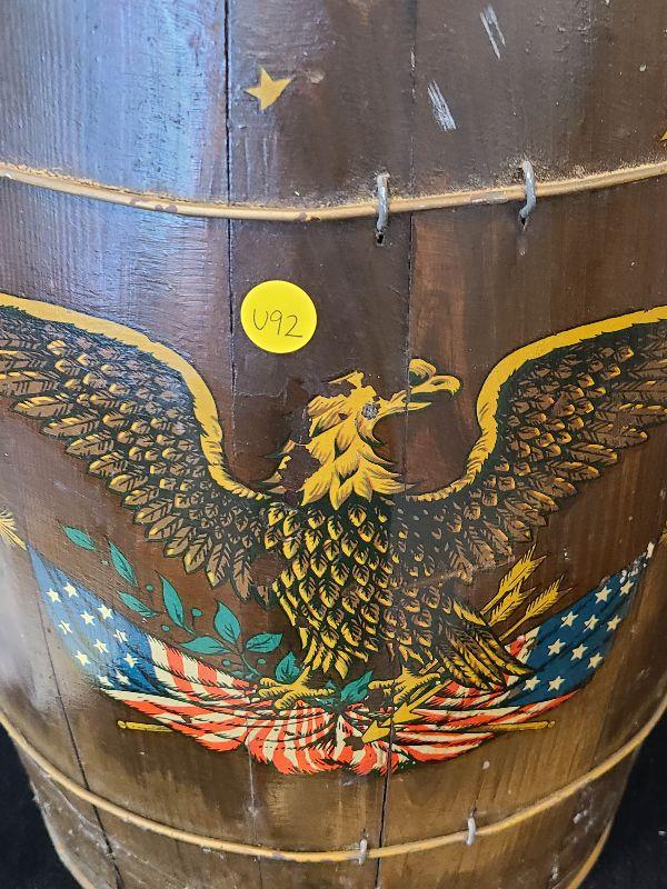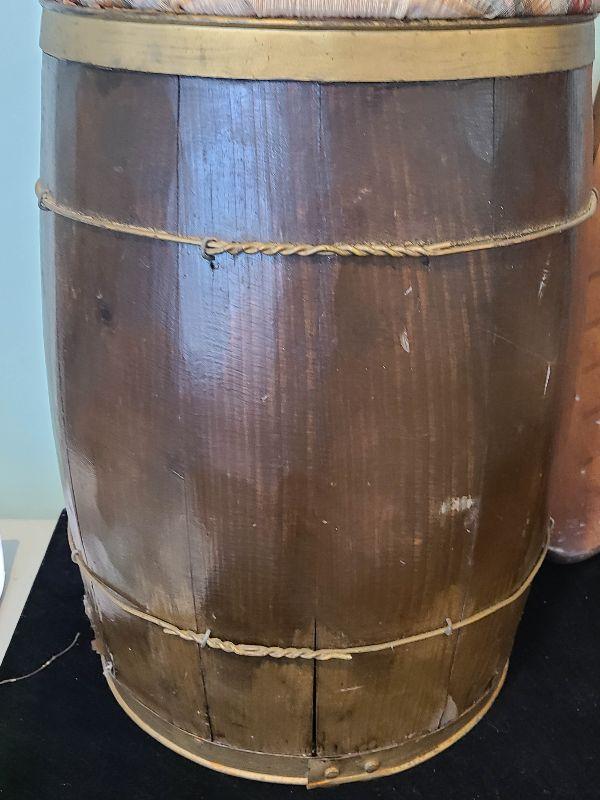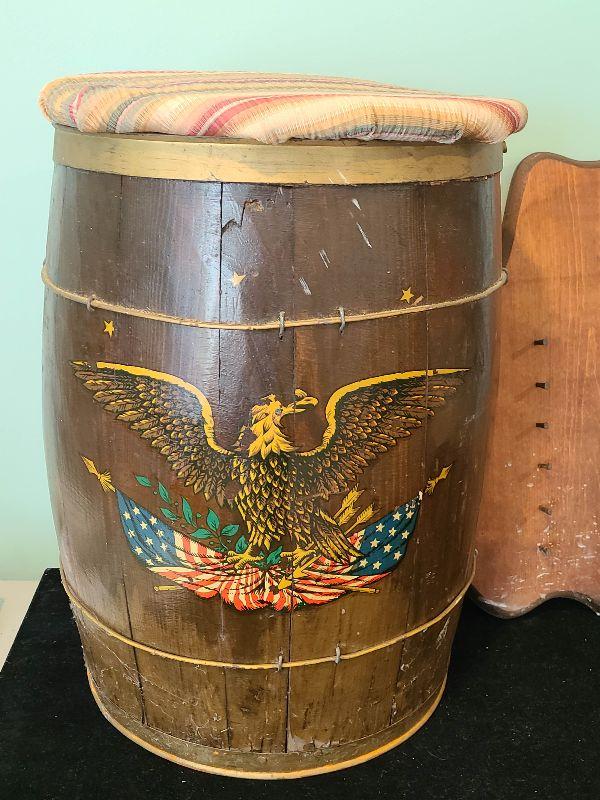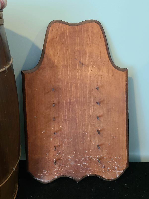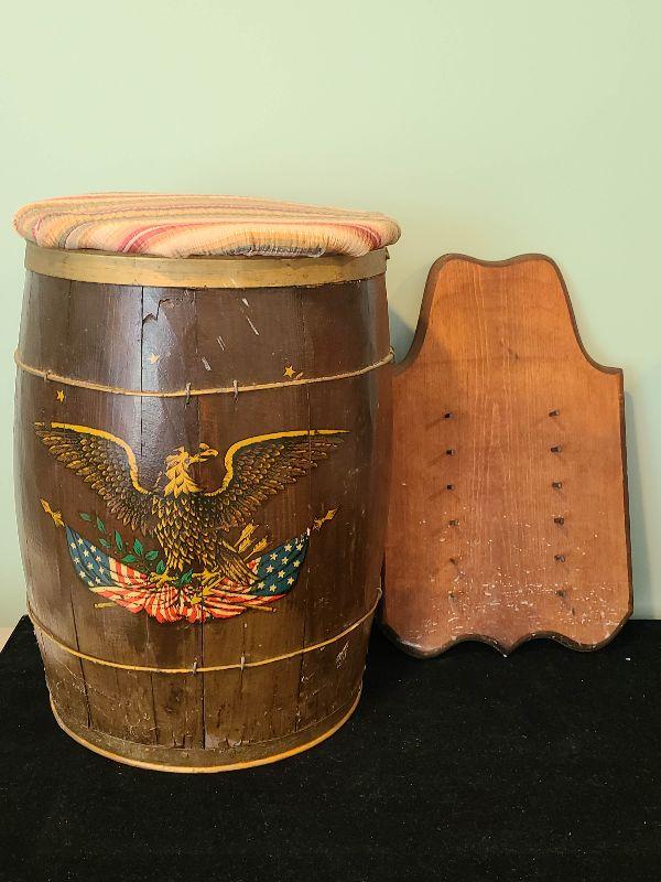 Vintage Barrel for décor and storage, and rack made with nails. . Barrel does show some age and wear. Please see pictures for contents of the lot, condition of the lot, and any measurements of the item. Thank you for looking and happy bidding!