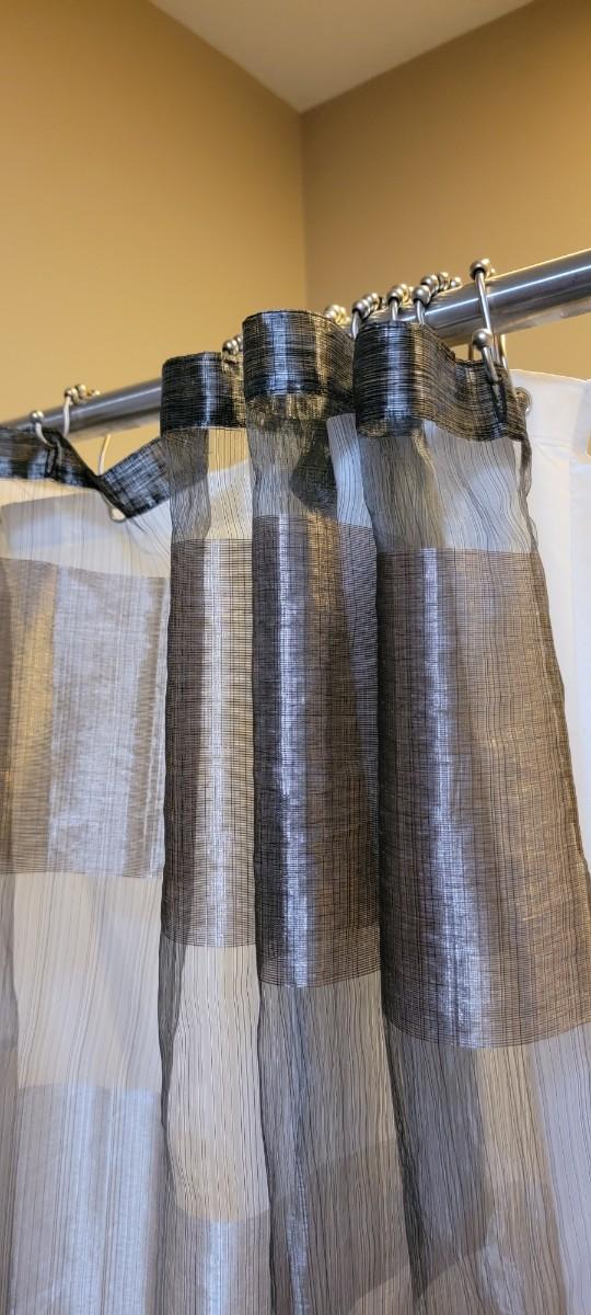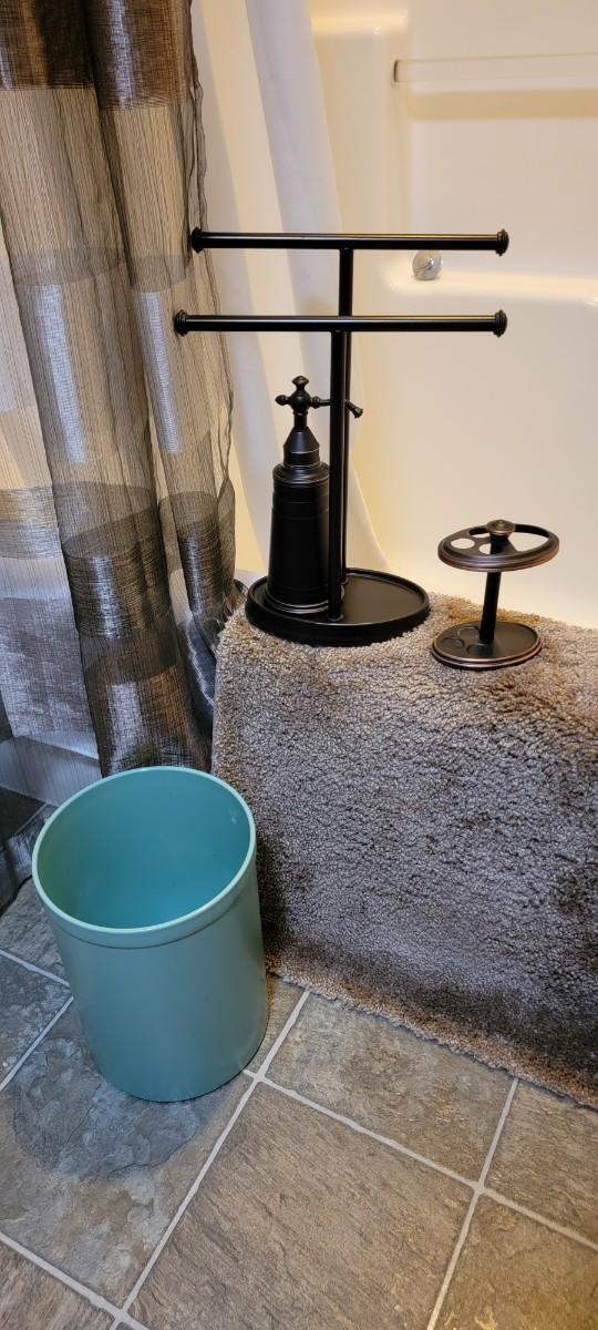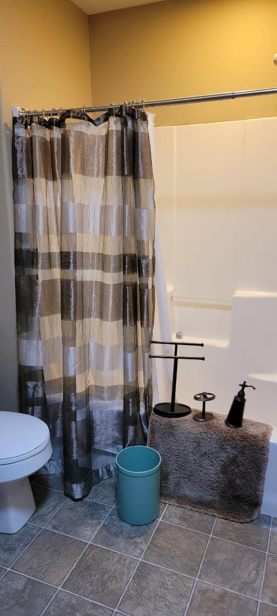 UB-1 Shower curtain brown tones with clips, trio counter towel. toothbrush, soap , brown rug, green wastebasket.