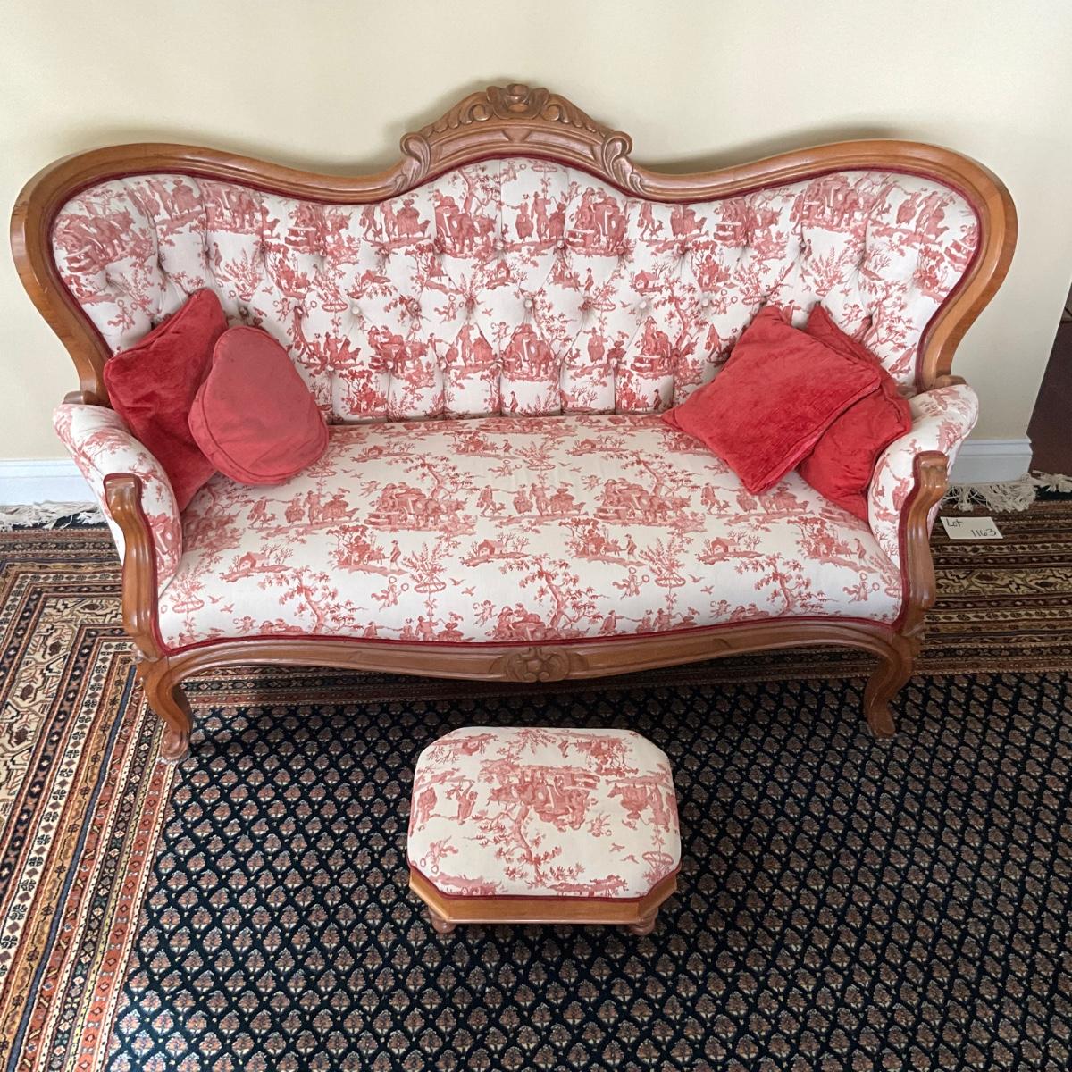 Beautiful Red and white Toile Upholstered Loveseat with matching stool