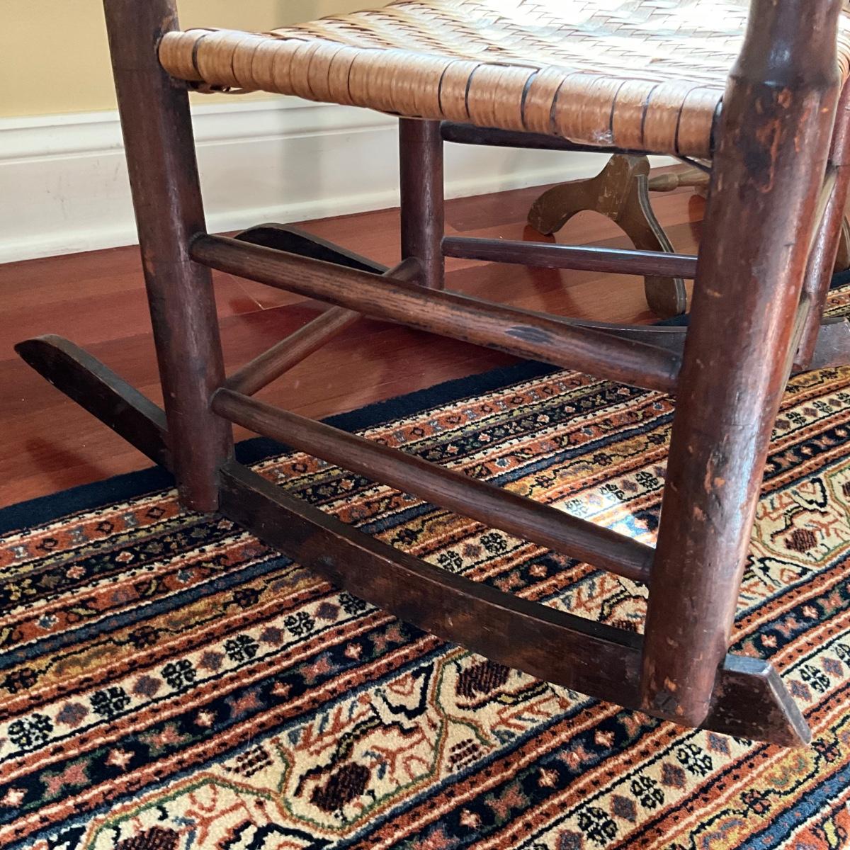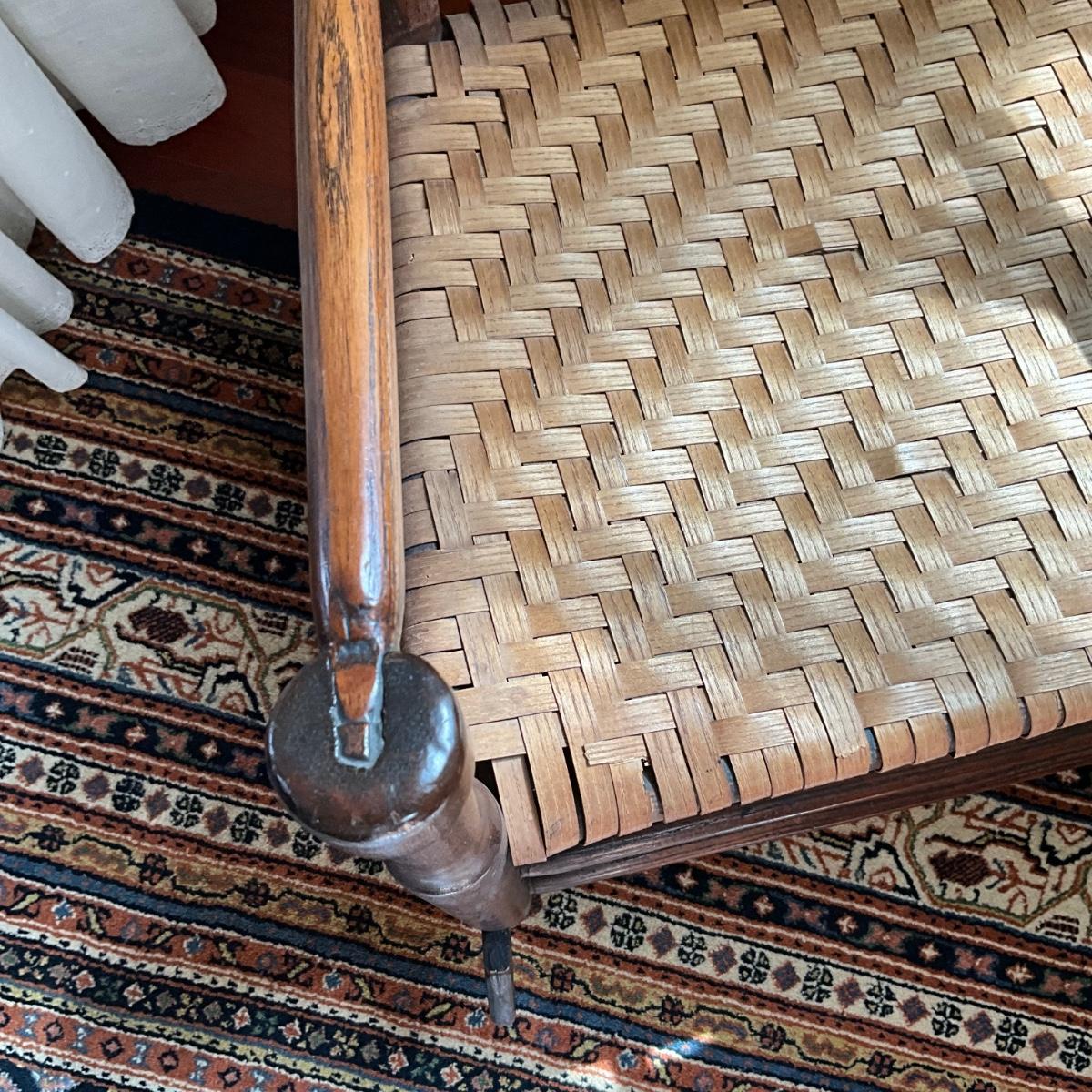 Antique Massachusetts Rocking chair has split oak seat and missing acorns on top. Measures 32.6" high x 20" wide