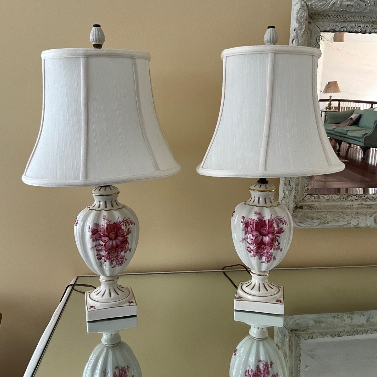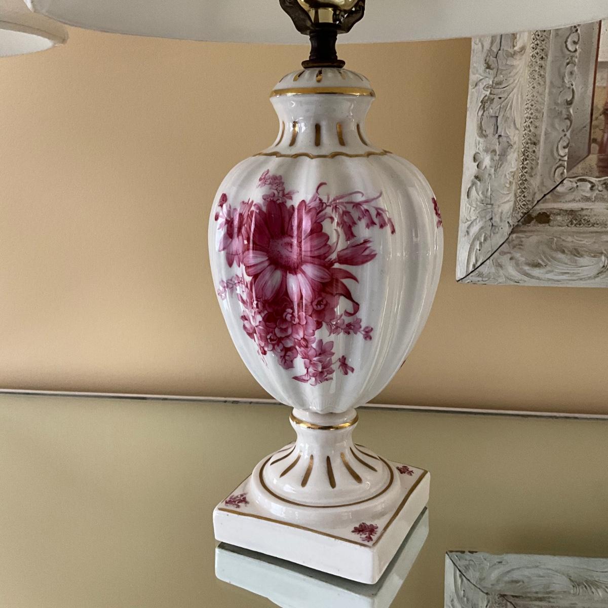 UB1176 Pair of Vintage Porcelain Floral and Gold Accent Lamps with Silk Shades