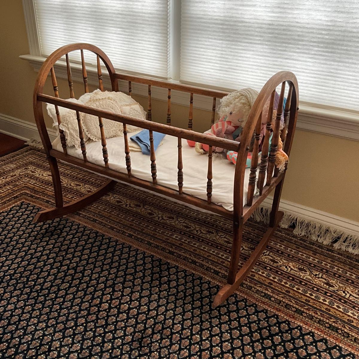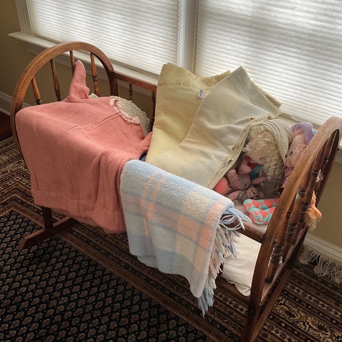 UB1186 Antique Oak Bentwood Cradle with Baby Blankets Pillows and more