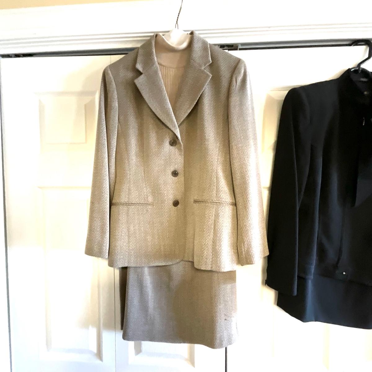 Emanuel Suit is Tan and Brown and has a spot on skirt