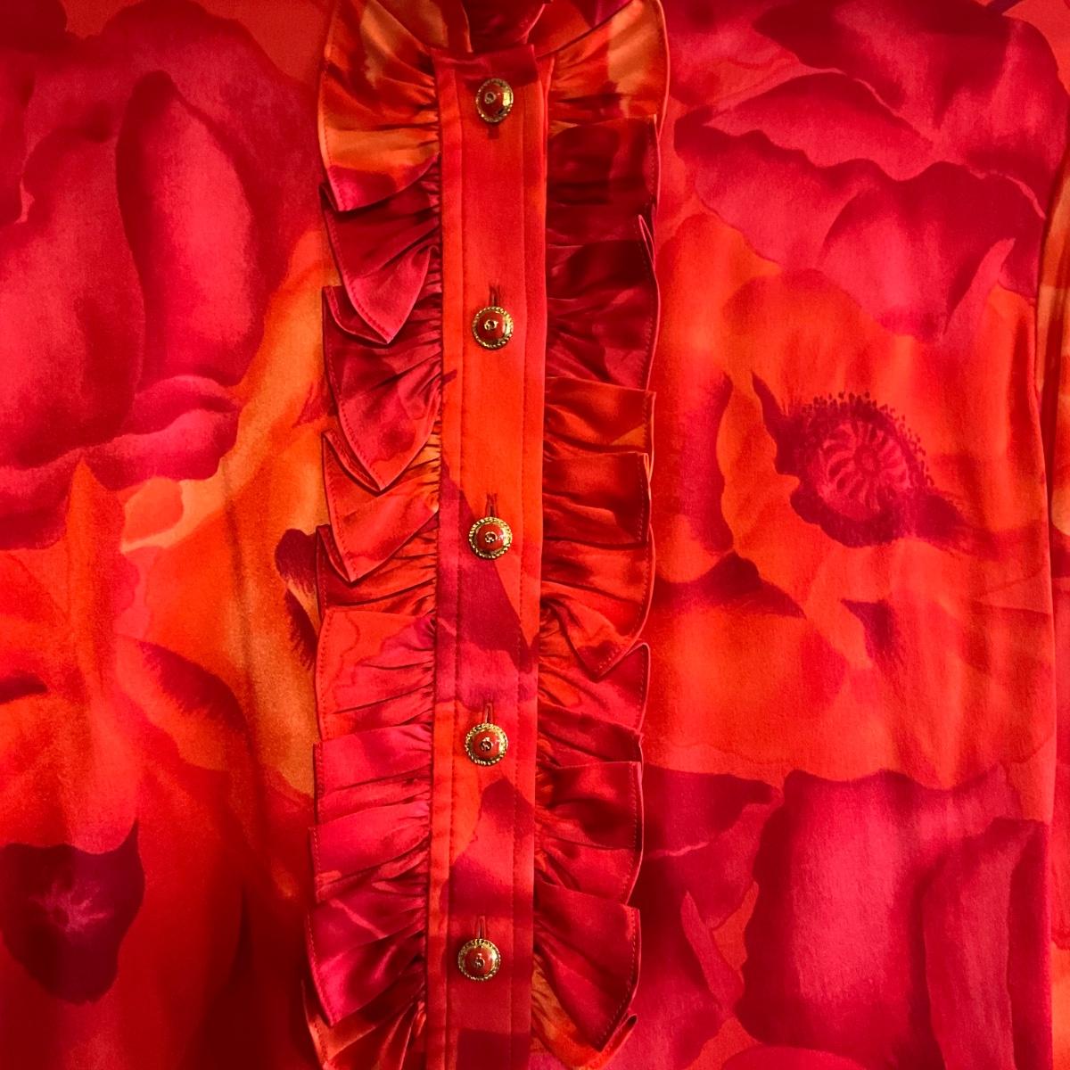 Excellent condition ST. JOHN Silk Blouse size 2 Button up front with fabulous floral design