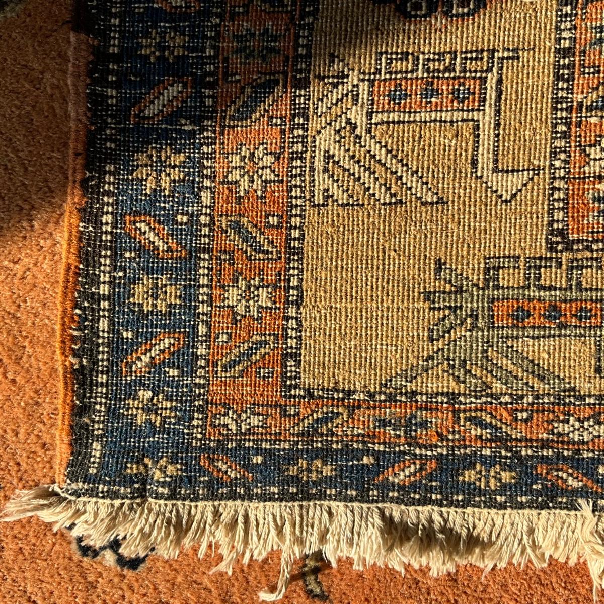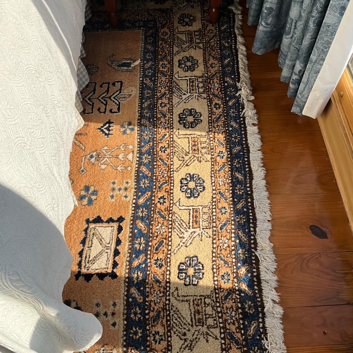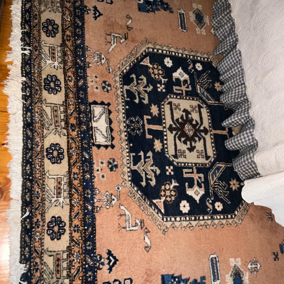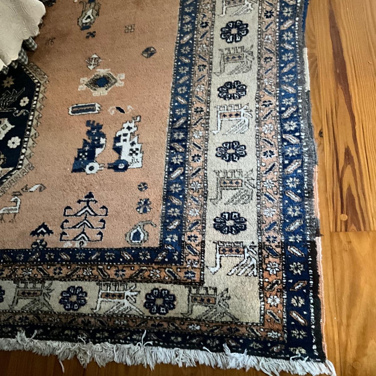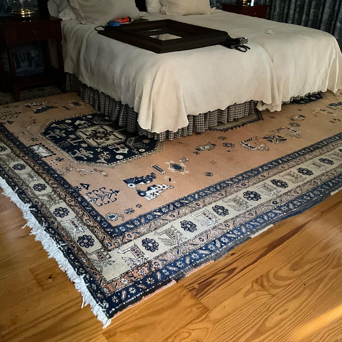 This rug has fading on one side and measures 9'6" x 12'4"