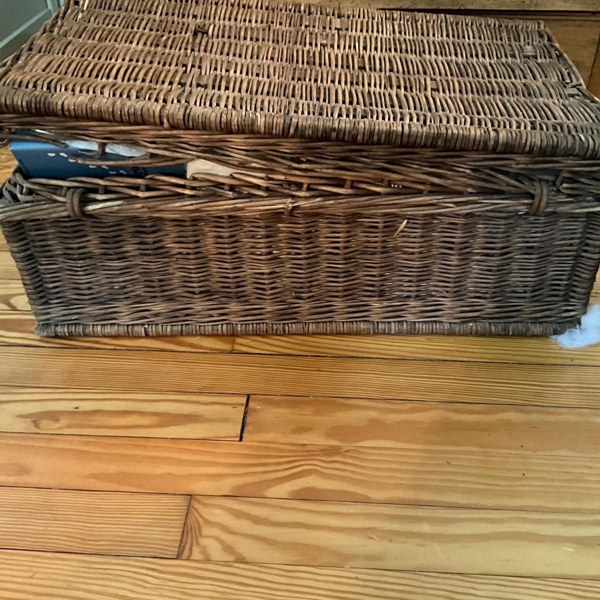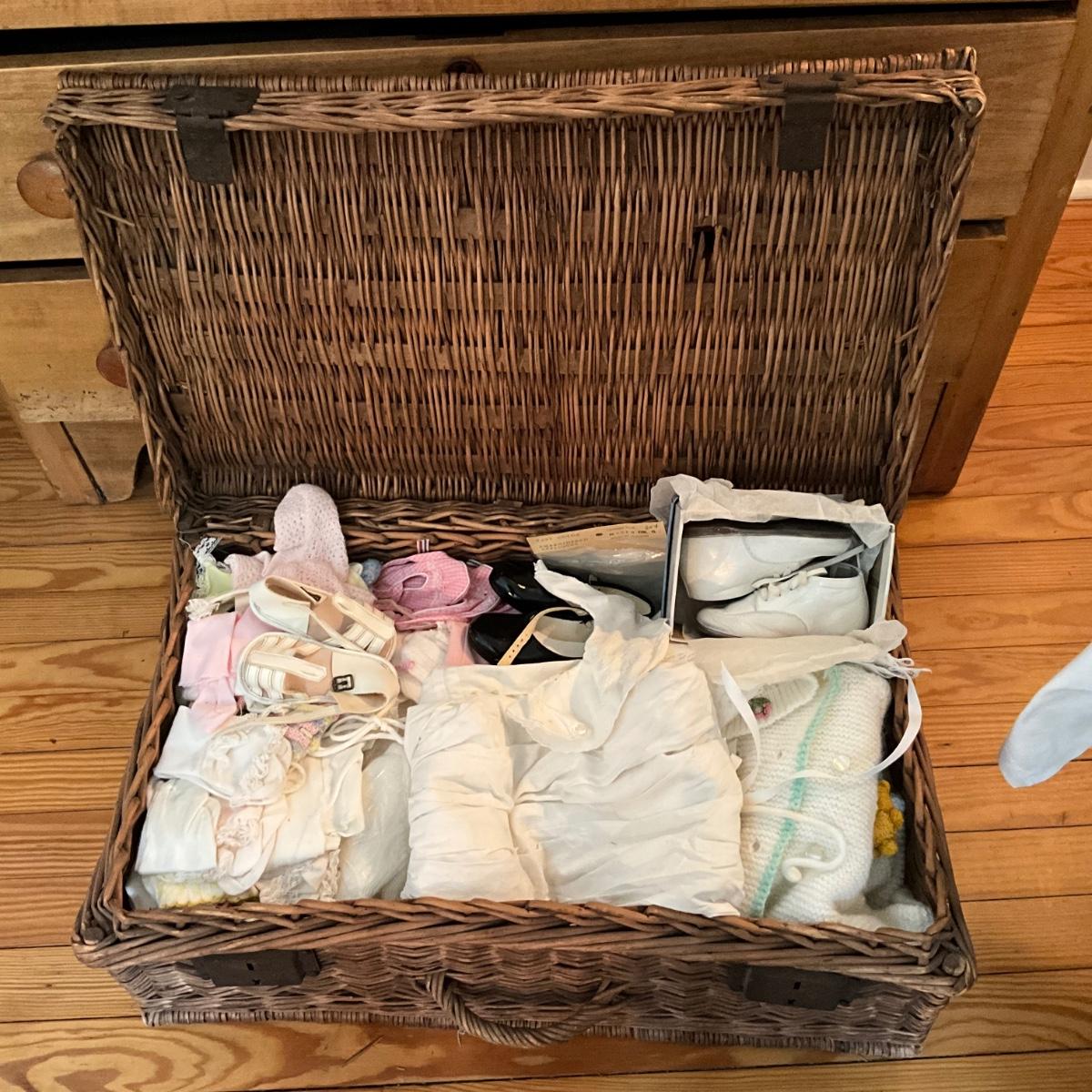 comes with various assortments of vintage children's shoes ad clothes with brown wicker basket