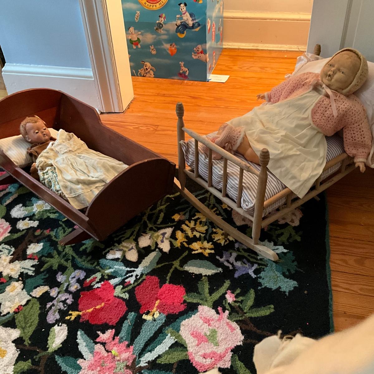 UBB1333 Two Vintage Dolls with Doll Cradles and Victorian Blanket