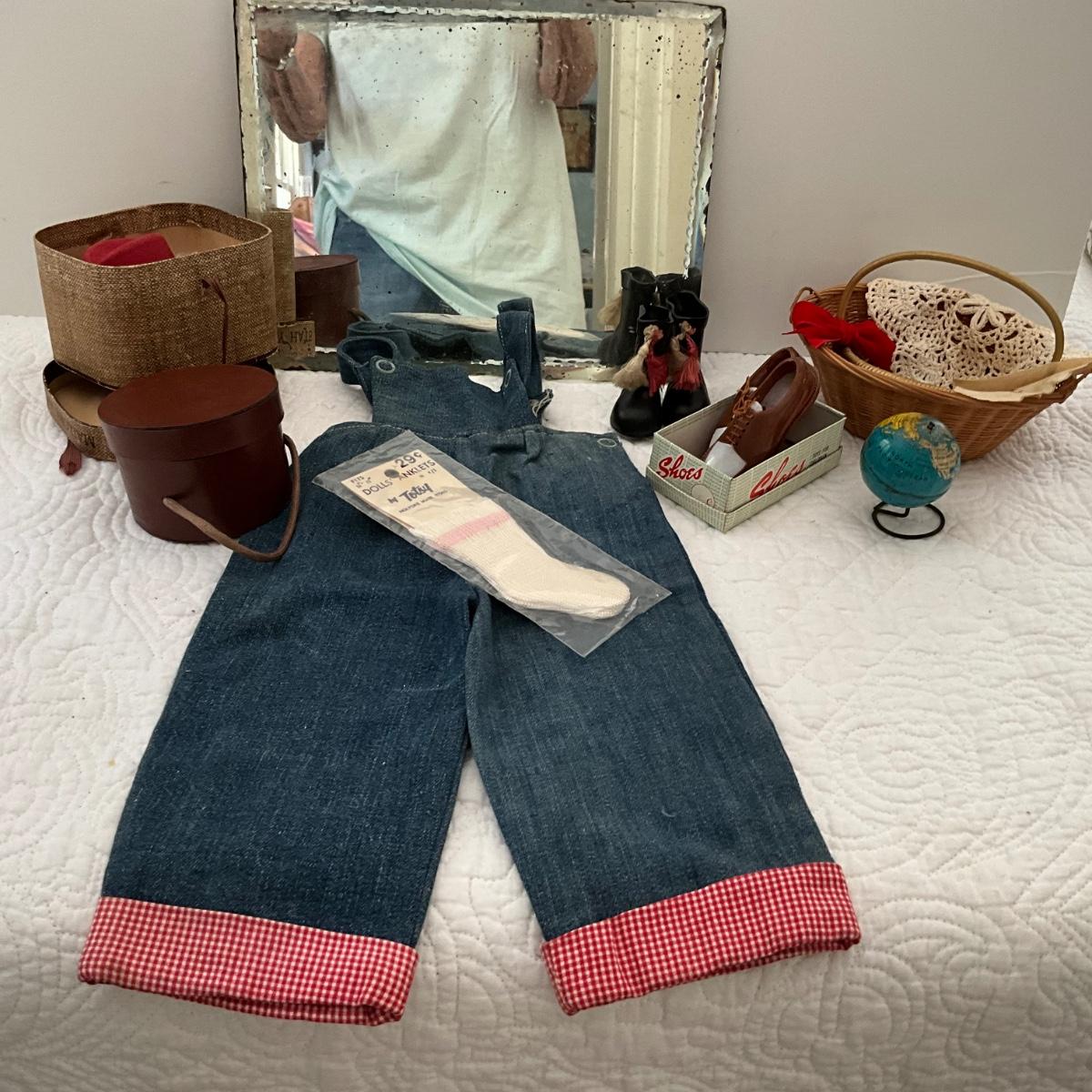 Comes with old mirror, red doll hat, cheese box, pair of doll overalls, pair of doll socks, pair of doll boots, doll mens shoes, 2 small baskets with accompanying dolls, and a miniature world globe.