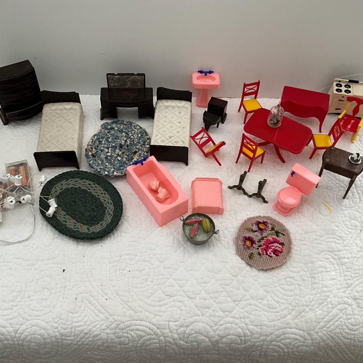 comes with miniature beds, chairs, tables, rugs, toilet, sink, and bathtub