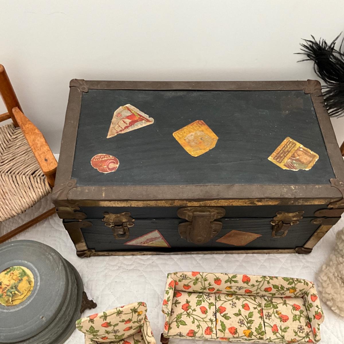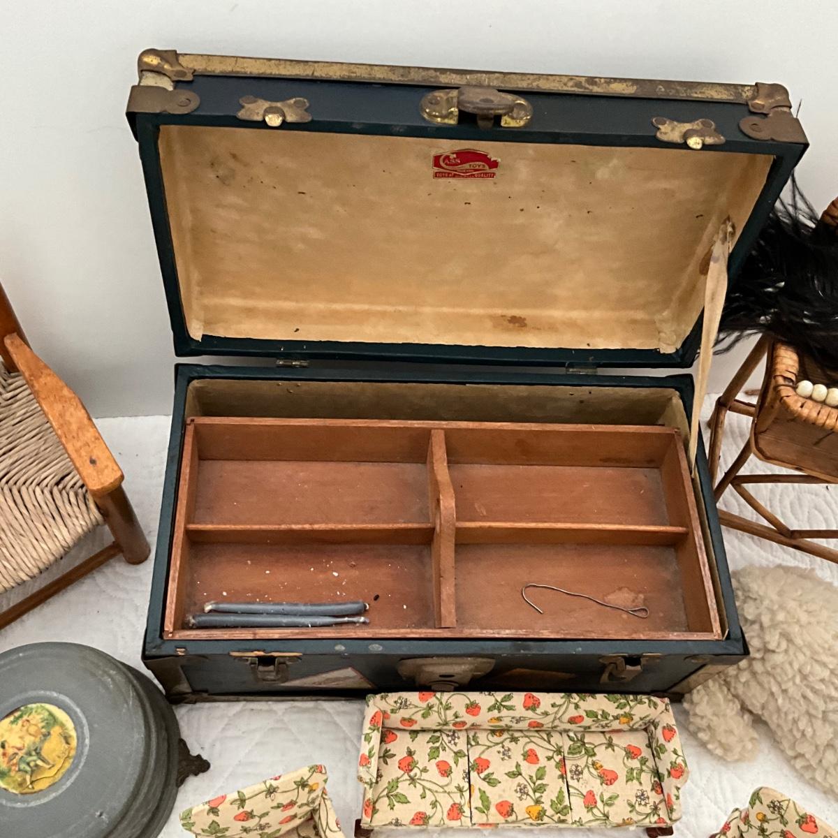 Comes with doll chest, sofa seat, small woven chair, doll high chair, sheep stuffed animal, and vintage child's music box.