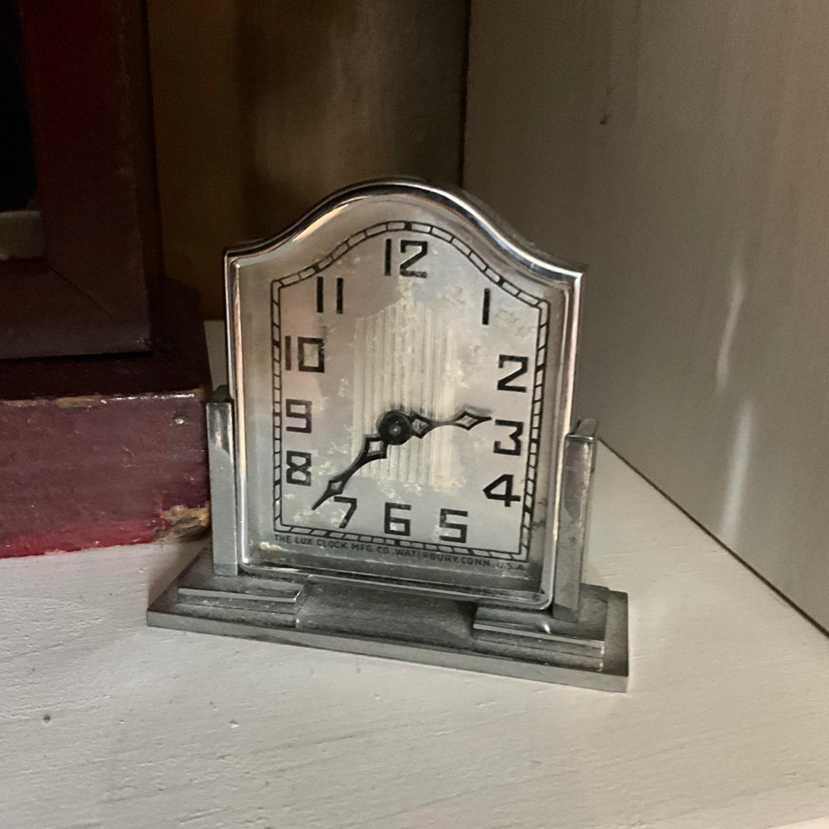 Small display cabinet with doll size dry sink and miniature china with small childs desk clock
