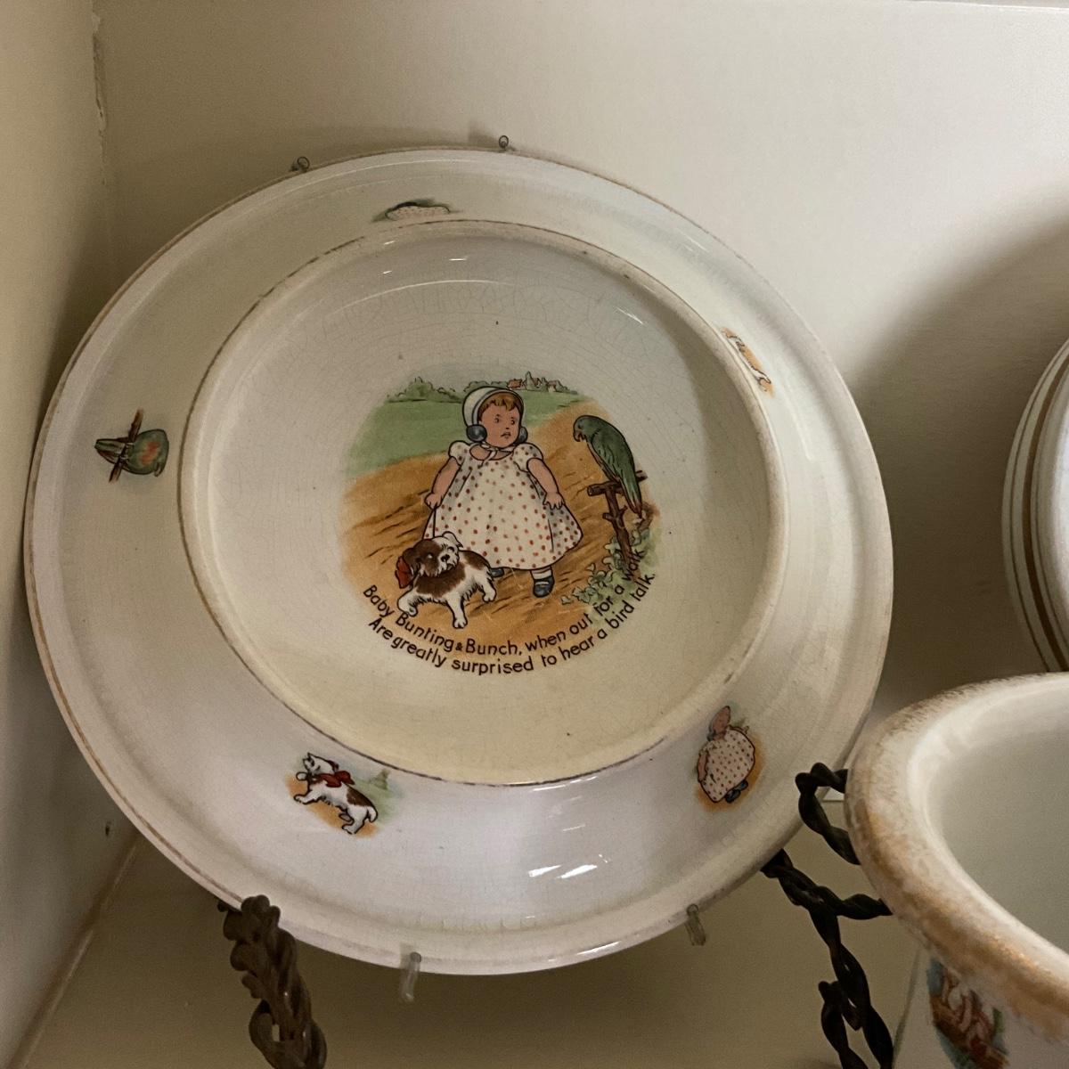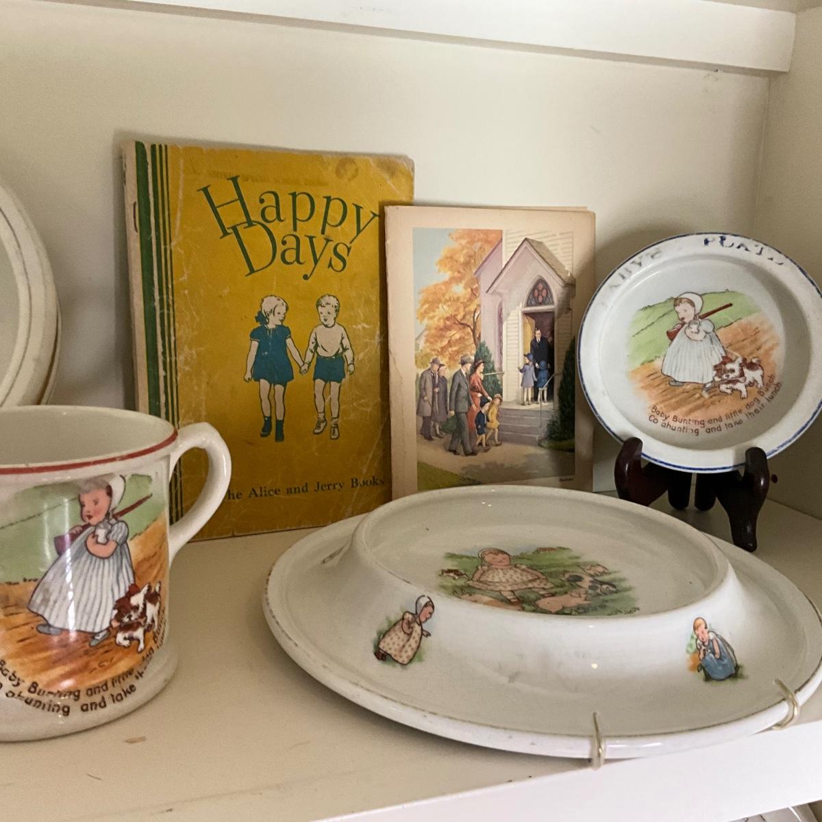 (Middle shelf) Depicting little girl in polka dot dress playing ,