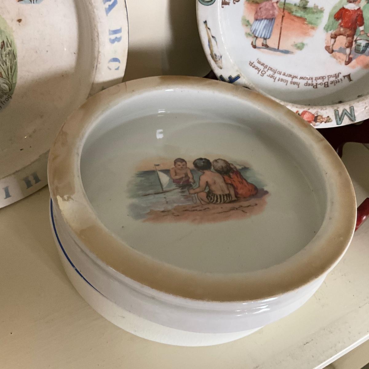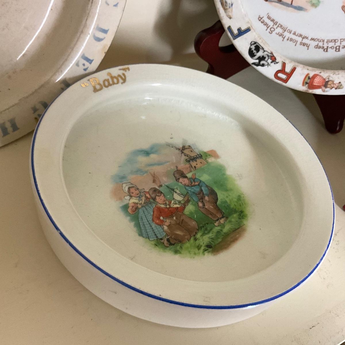 Several alphabet children's baby plates, and daffy duck warming plate (missing cork)