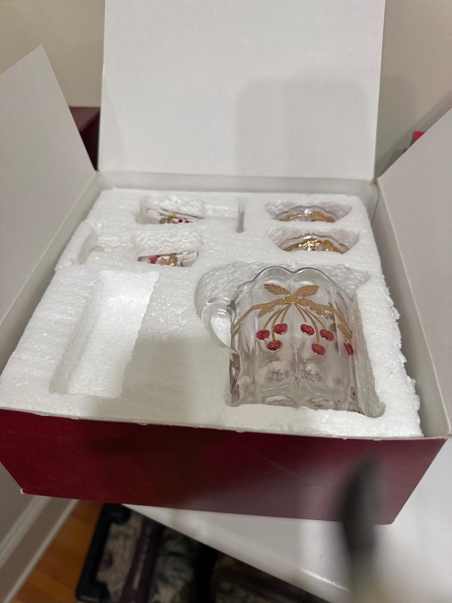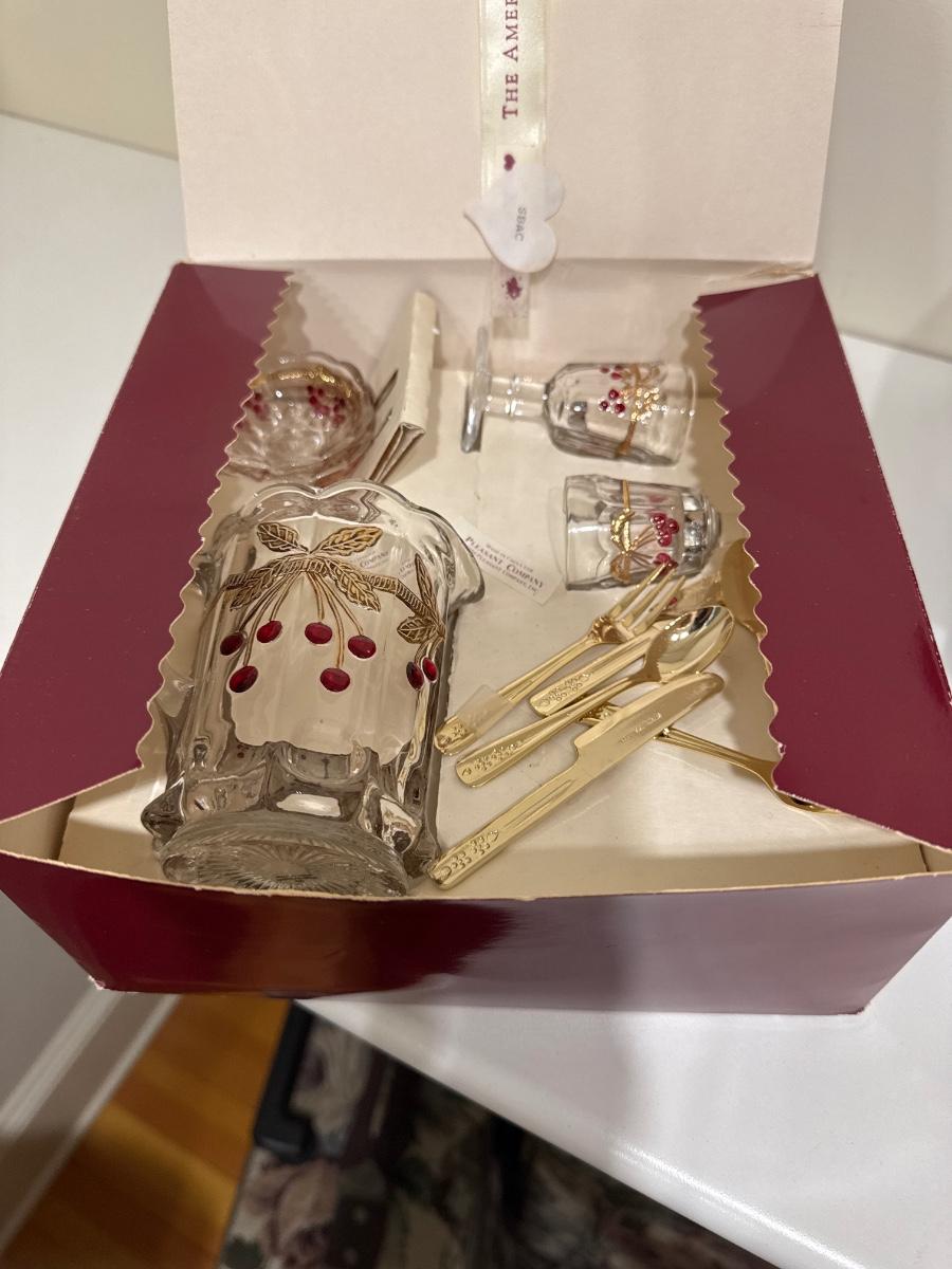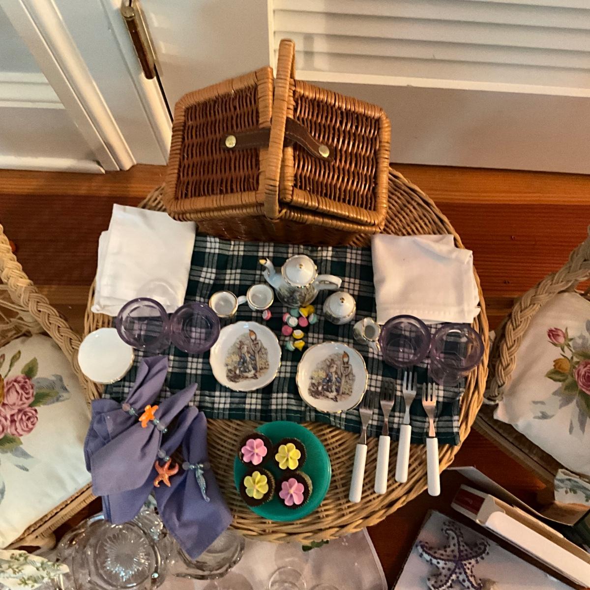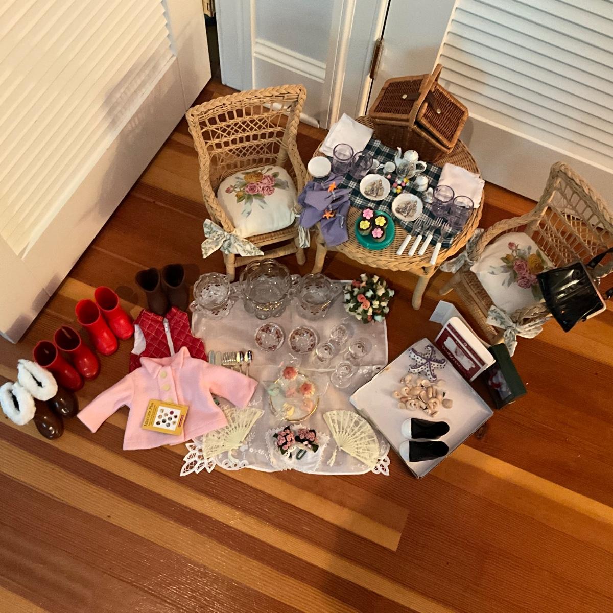 Various miniature american girl doll accessories with glassware, table and chairs , shoes, and more
