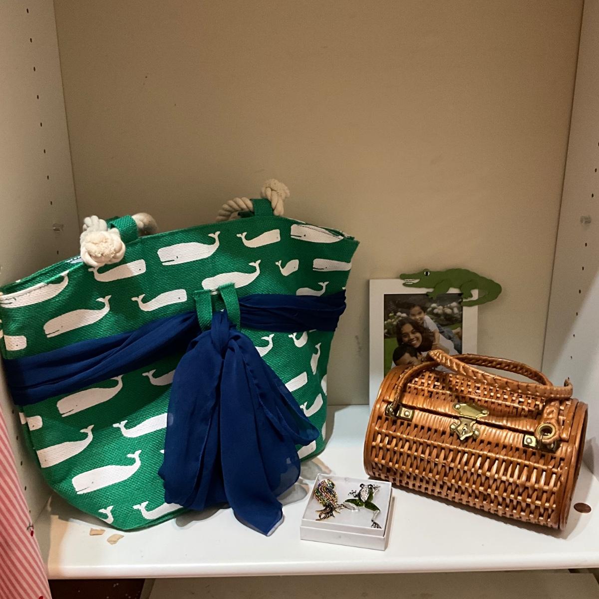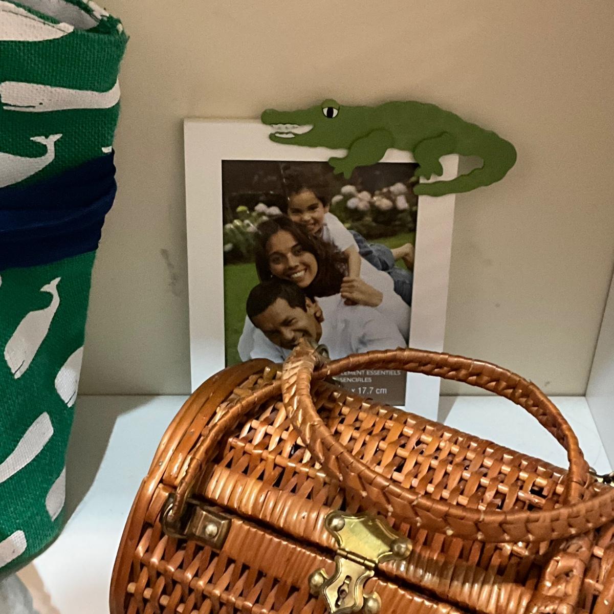 Whale beach bag with two brooches, frog and parrot, basket purse and alligator picture frame