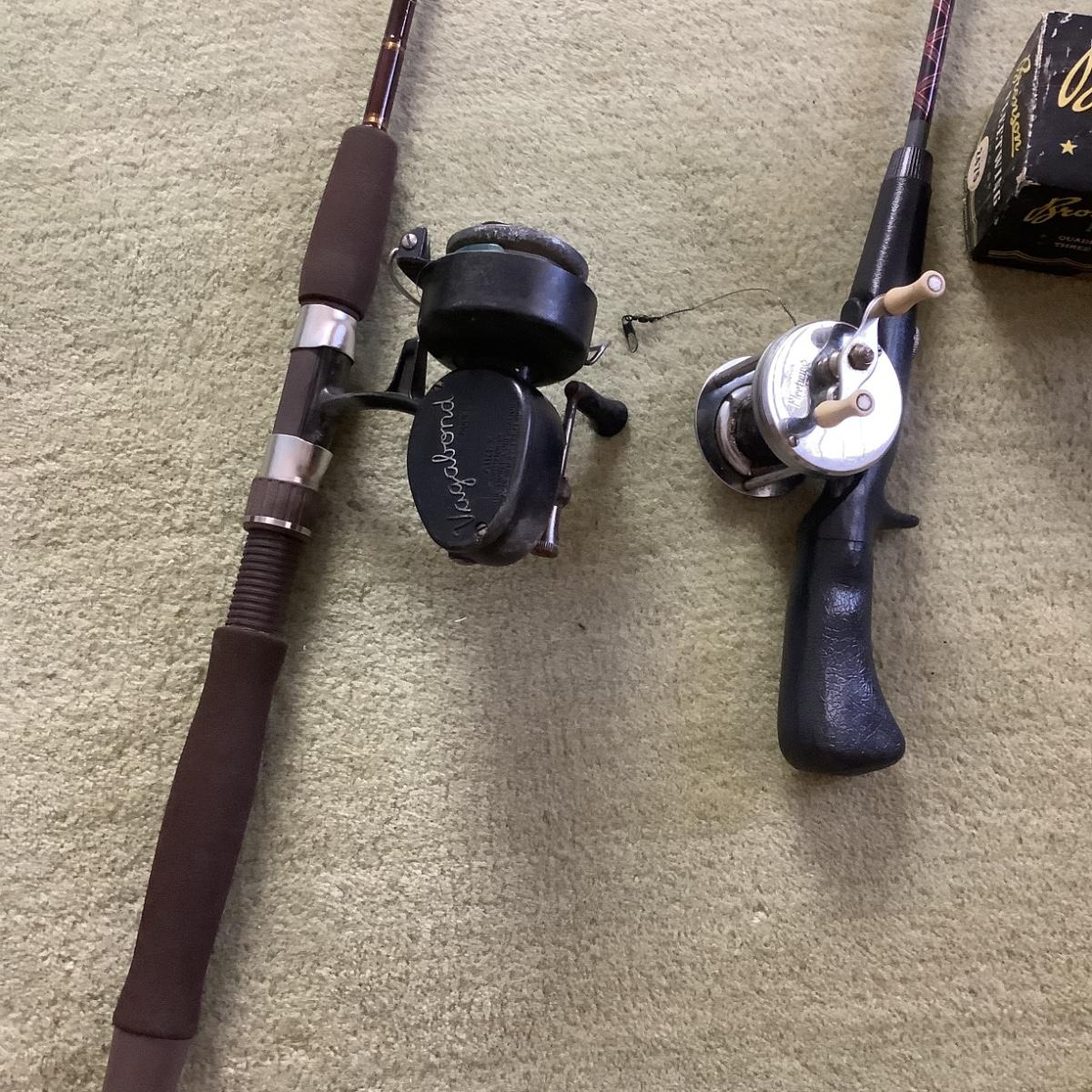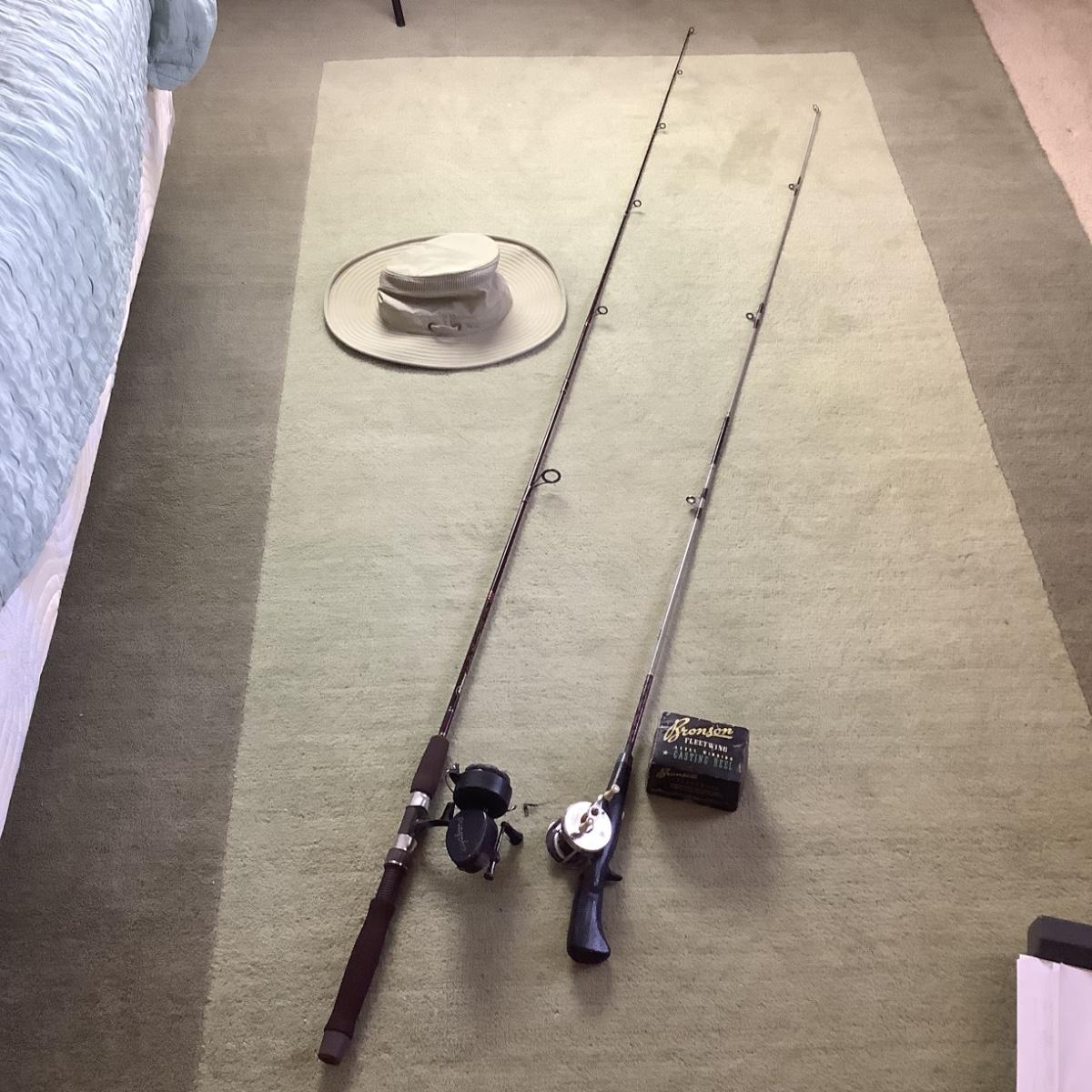 zebco 5’6” heavy action with Bronson fleet wing level winding cast reel with Kunman Graphite 6’6” medium action reel with vagabond model 1 reel and fishing hat