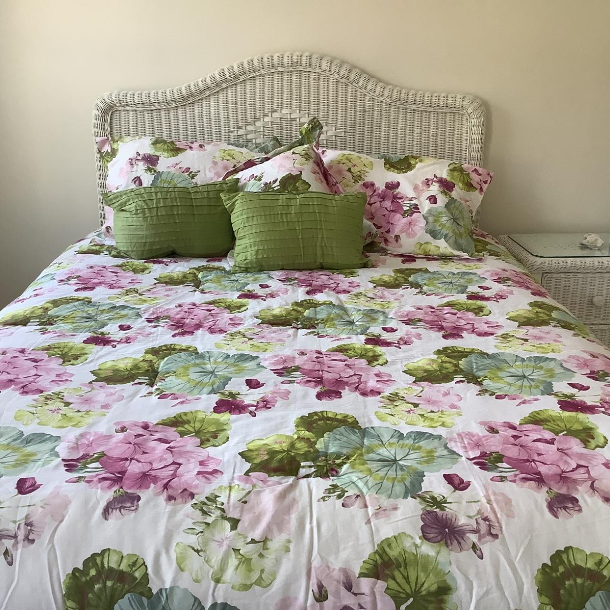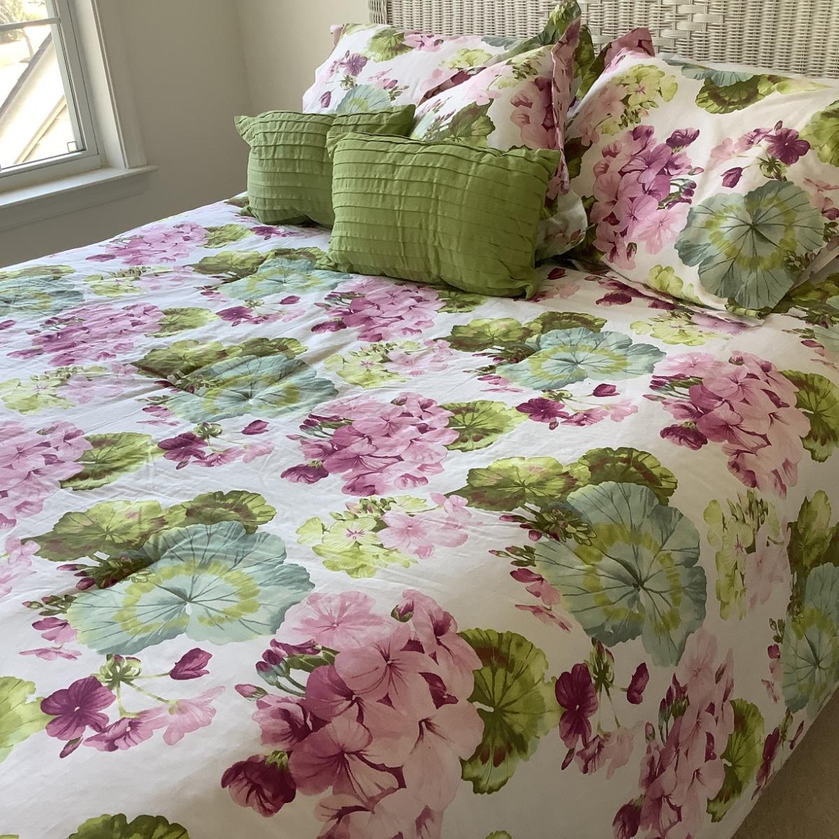 Includes one queen-sized bed cover, 2 small green accent pillows, 2 large shams with one small matching sham
