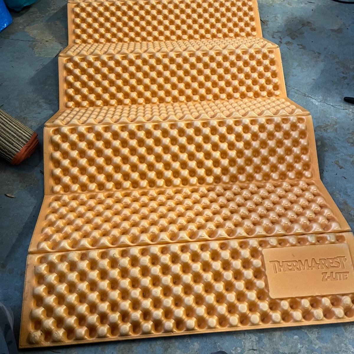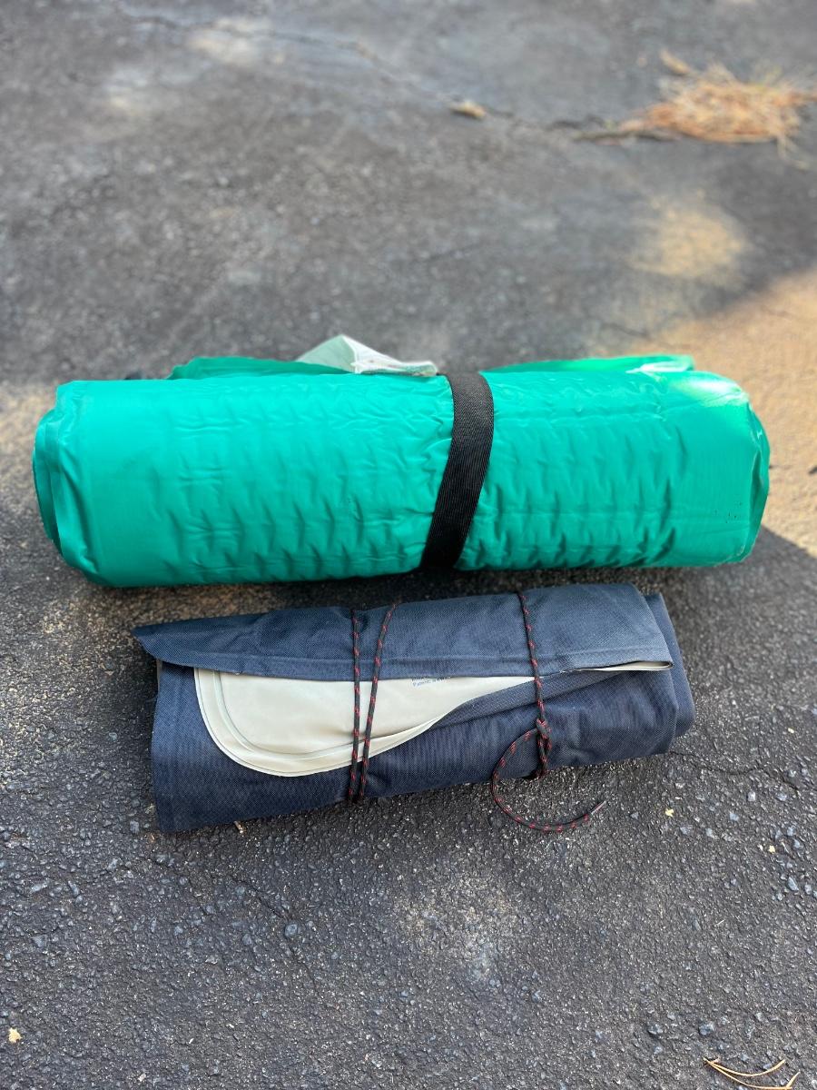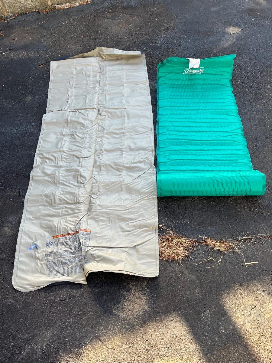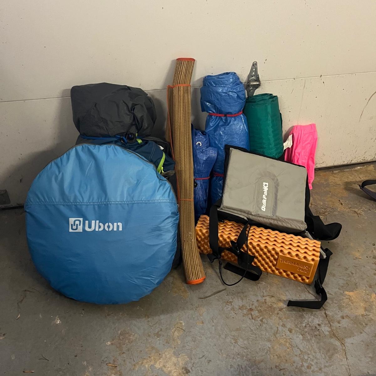 Lot contains a Ubon pop up tent that measures 64” x 46” x 36”. Also includes a twin air mattresses that looks like new, three tarps, Thermarest foam mat, a green blow up sleeping pad for camping, two roll up woven mats, a vintage pink blow up raft and a tent that has no poles.