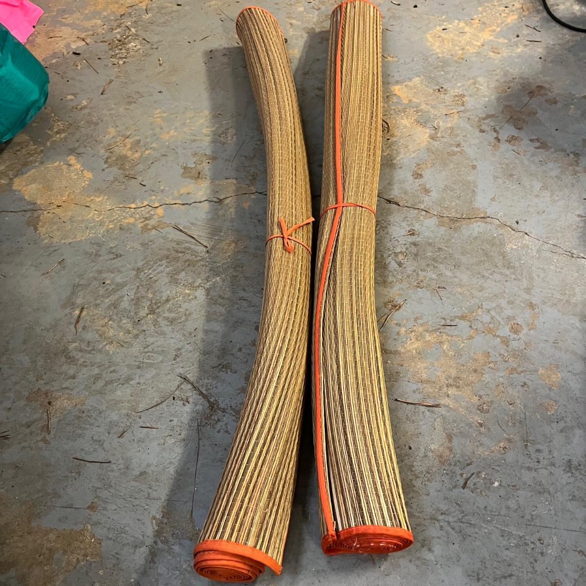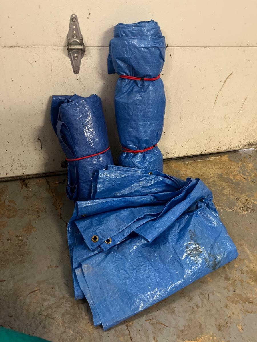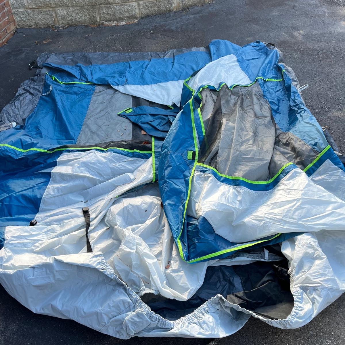 Lot contains a Ubon pop up tent that measures 64” x 46” x 36”. Also includes a twin air mattresses that looks like new, three tarps, Thermarest foam mat, a green blow up sleeping pad for camping, two roll up woven mats, a vintage pink blow up raft and a tent that has no poles.