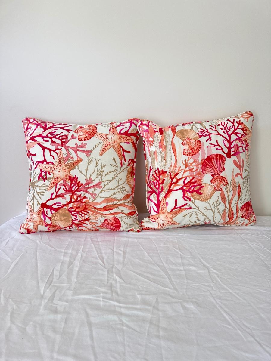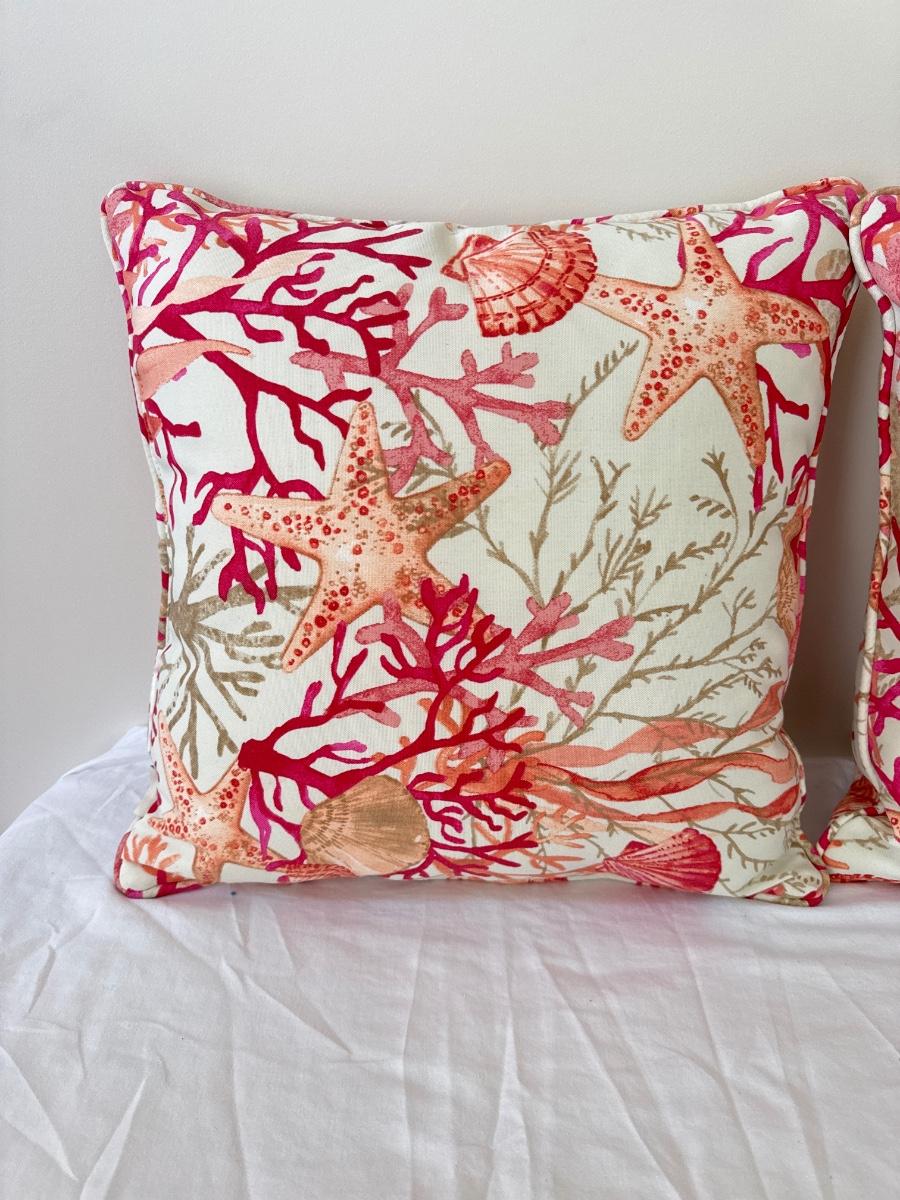 Pair of Pier I Imports coral reef design outdoor pillows. 17” square