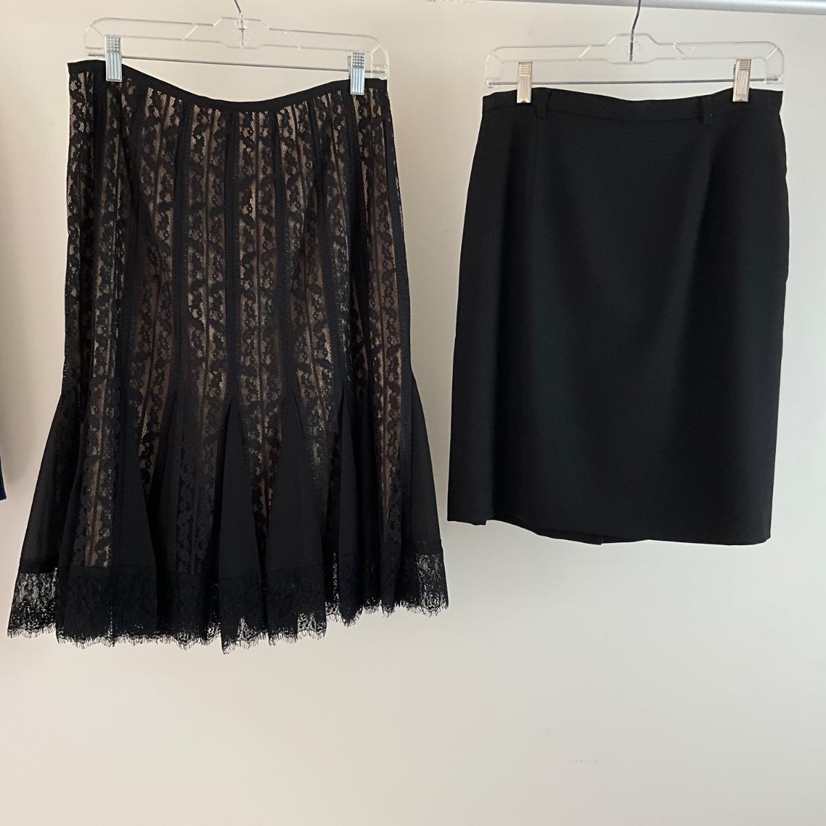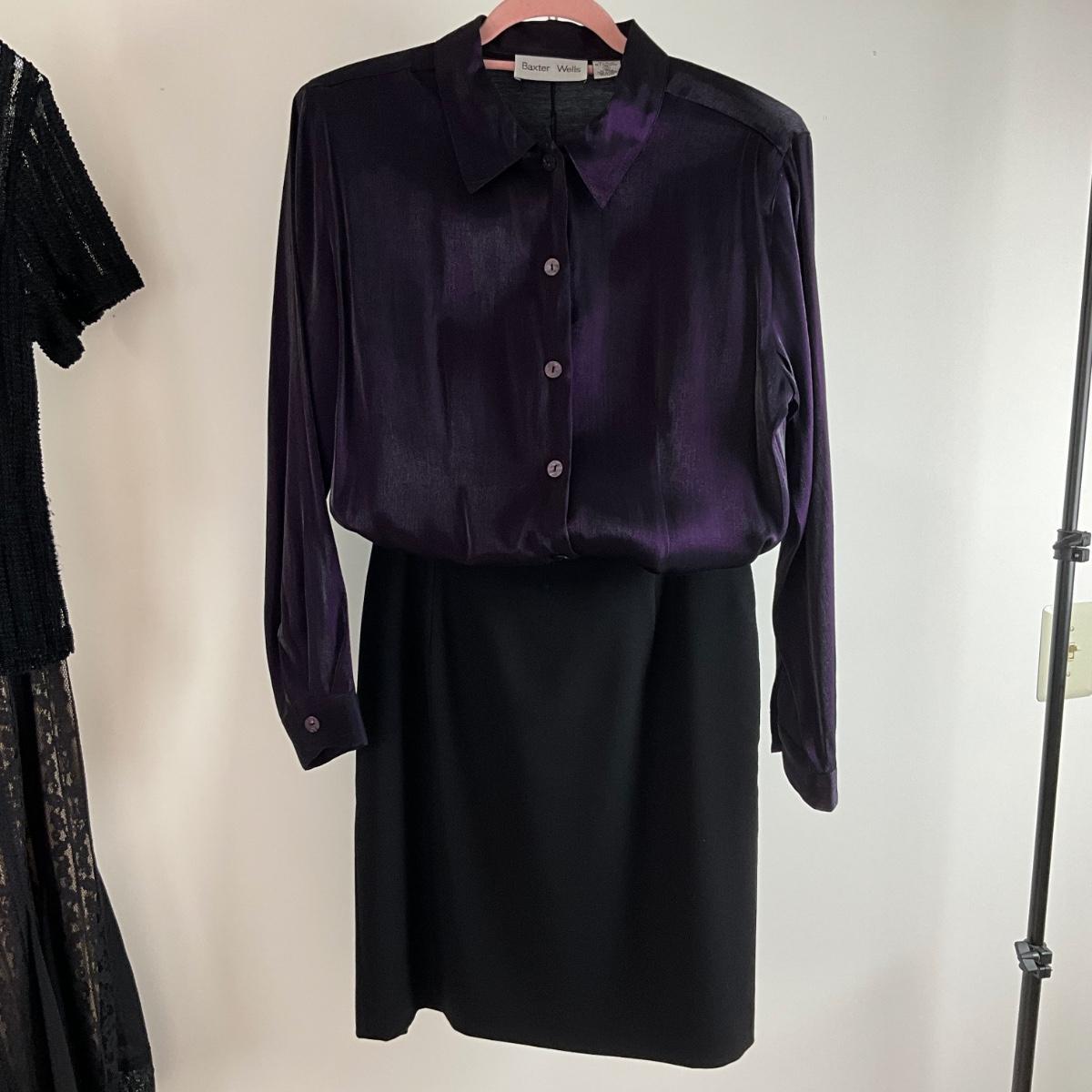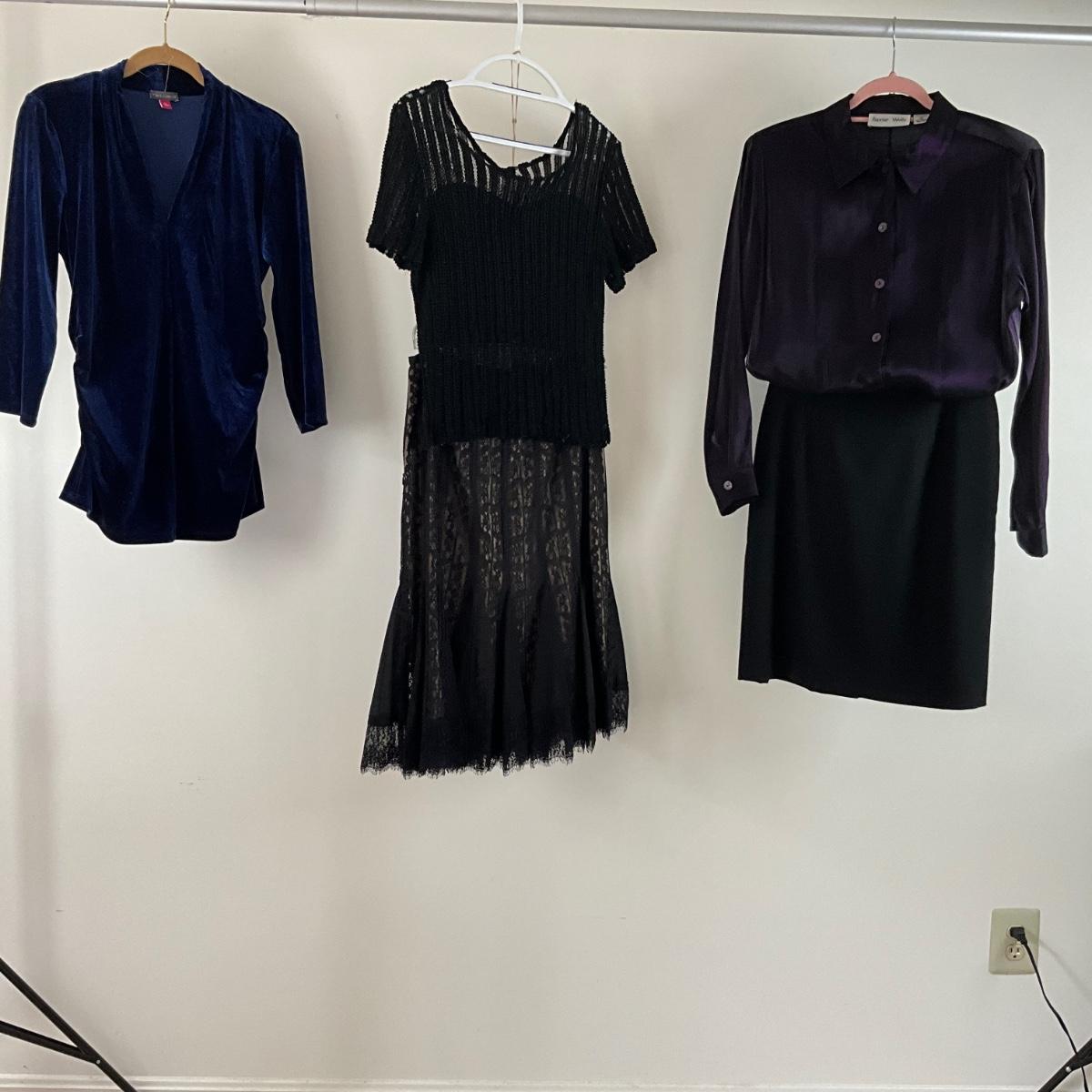 Blue velvet top by Vince Camuto-med, lace skirt by LOFT size 8, black wool blend by LOFT size 10, back lace top-small, Baxter & Wells purple iridescent -size 10