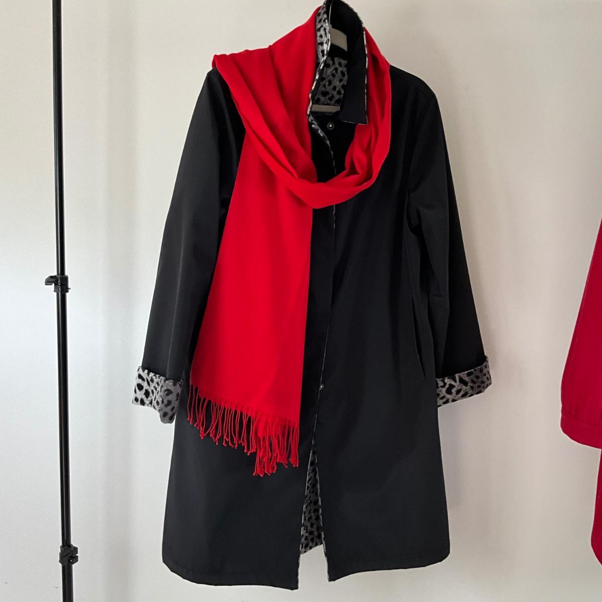 Raincoat w/Leopard print liner by Talbots-Medium, w/red cashmere red silk scarf by Pashmina