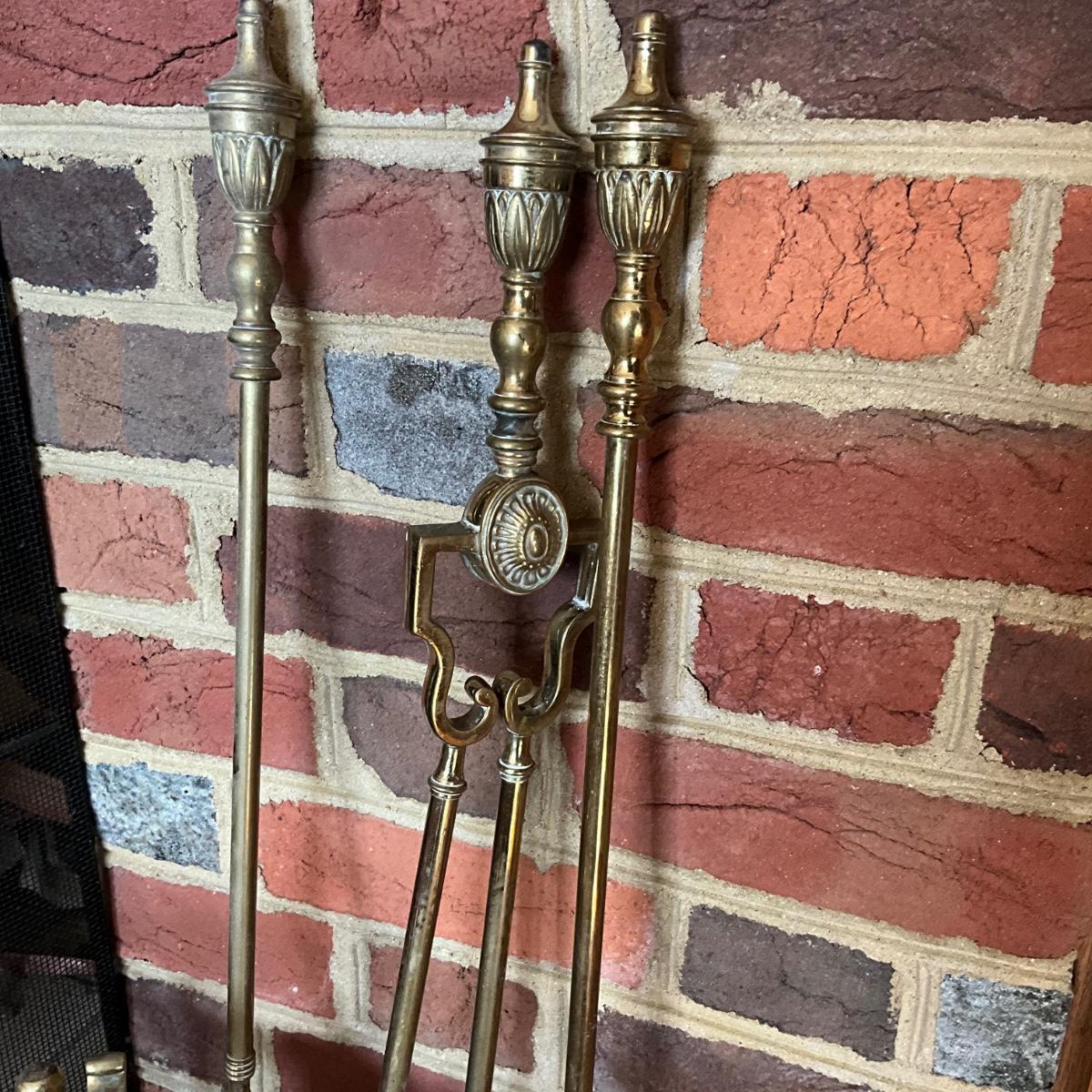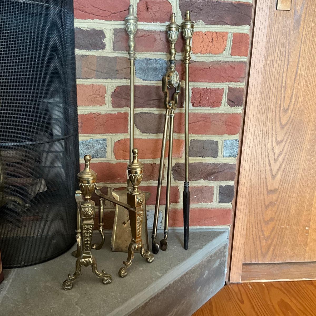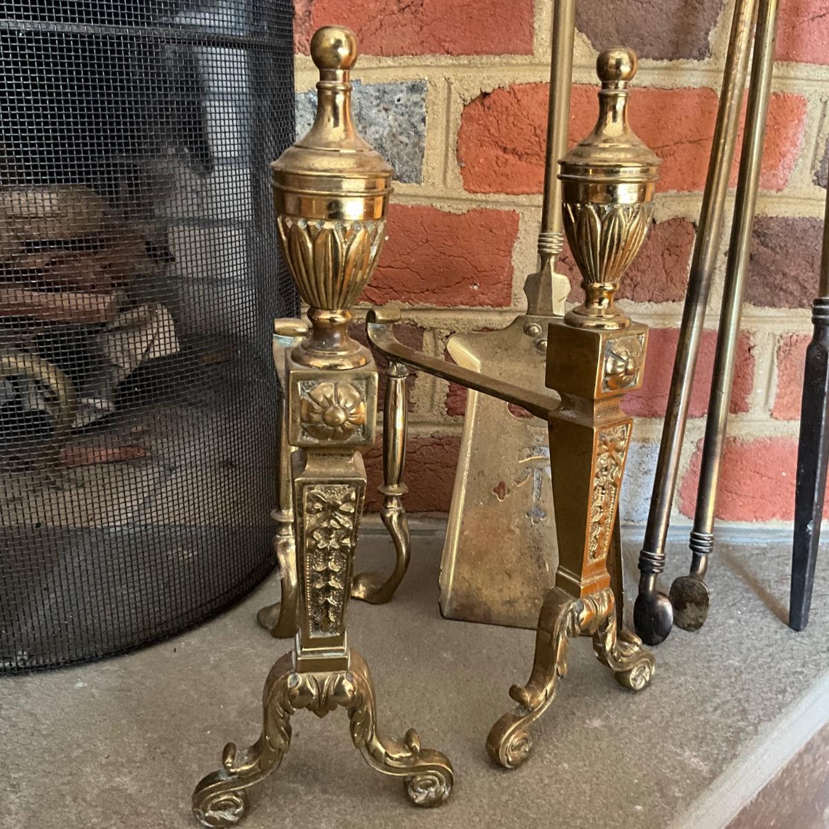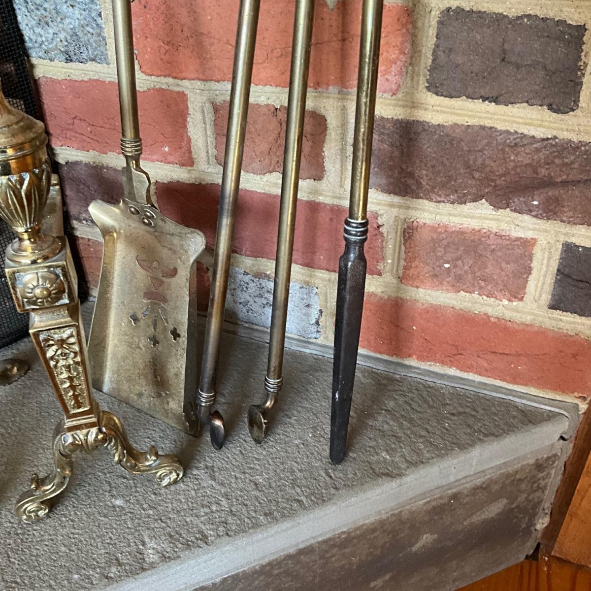 UC811 Set of Antique French Style Brass Andirons and Fireplace Tools