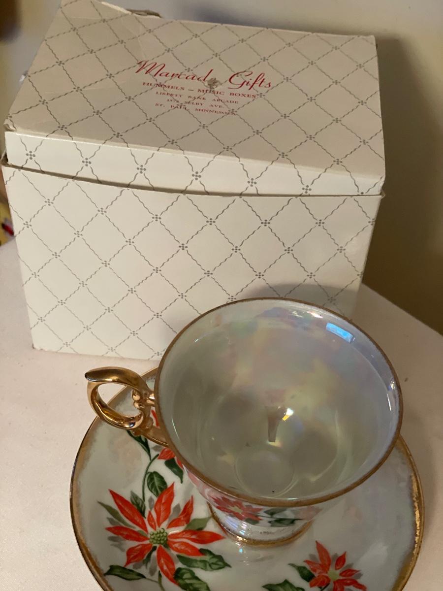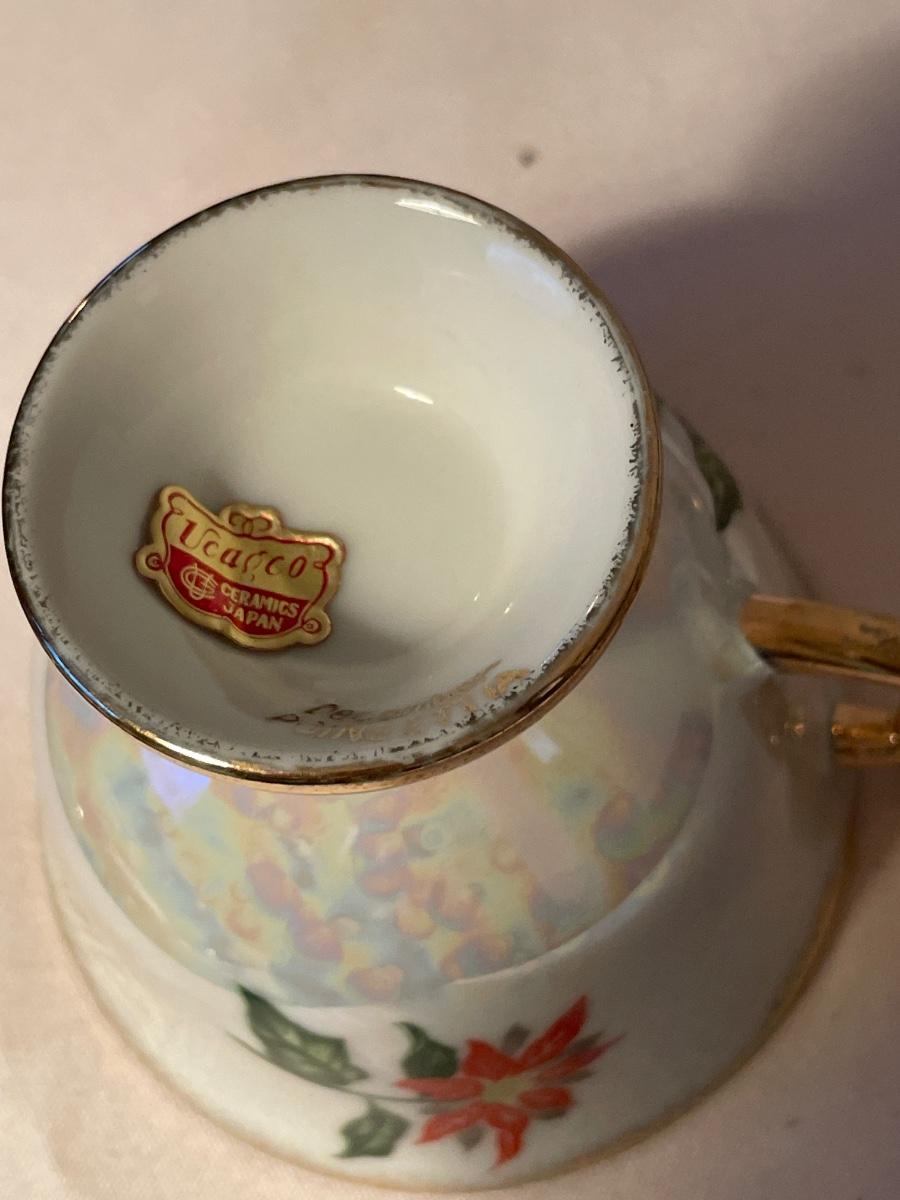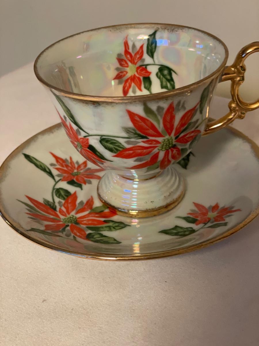 UCAGCO Footed Tea Cup & Saucer December Pointsettia Iridescent Pearl Japan