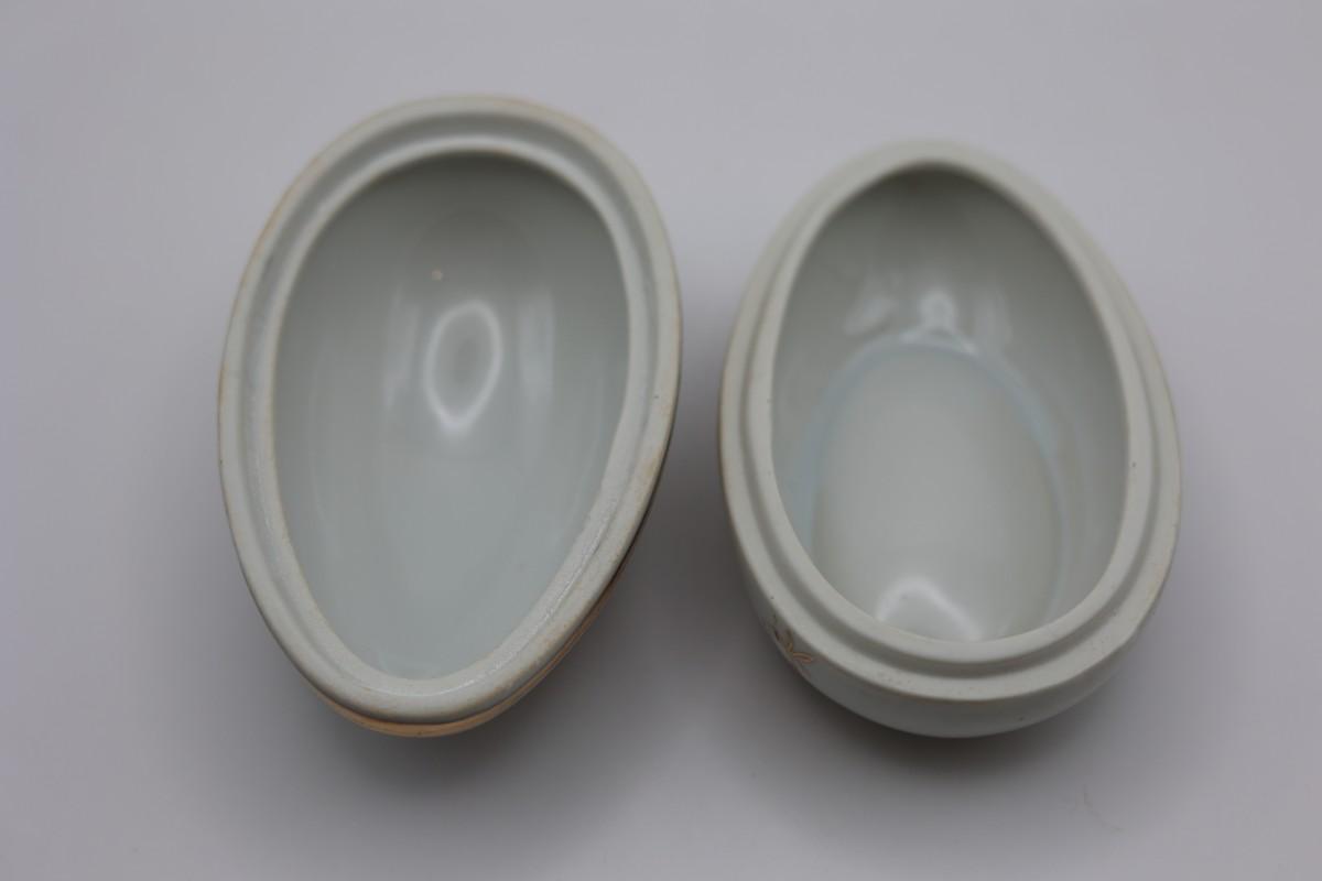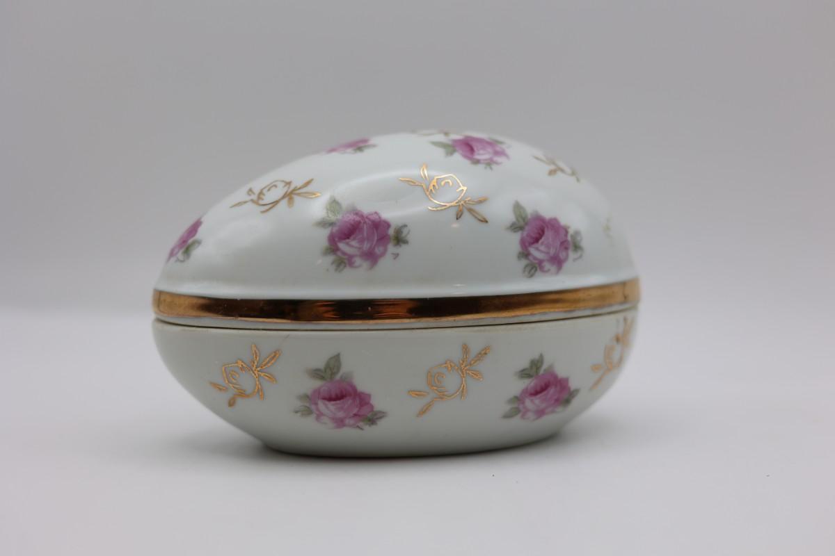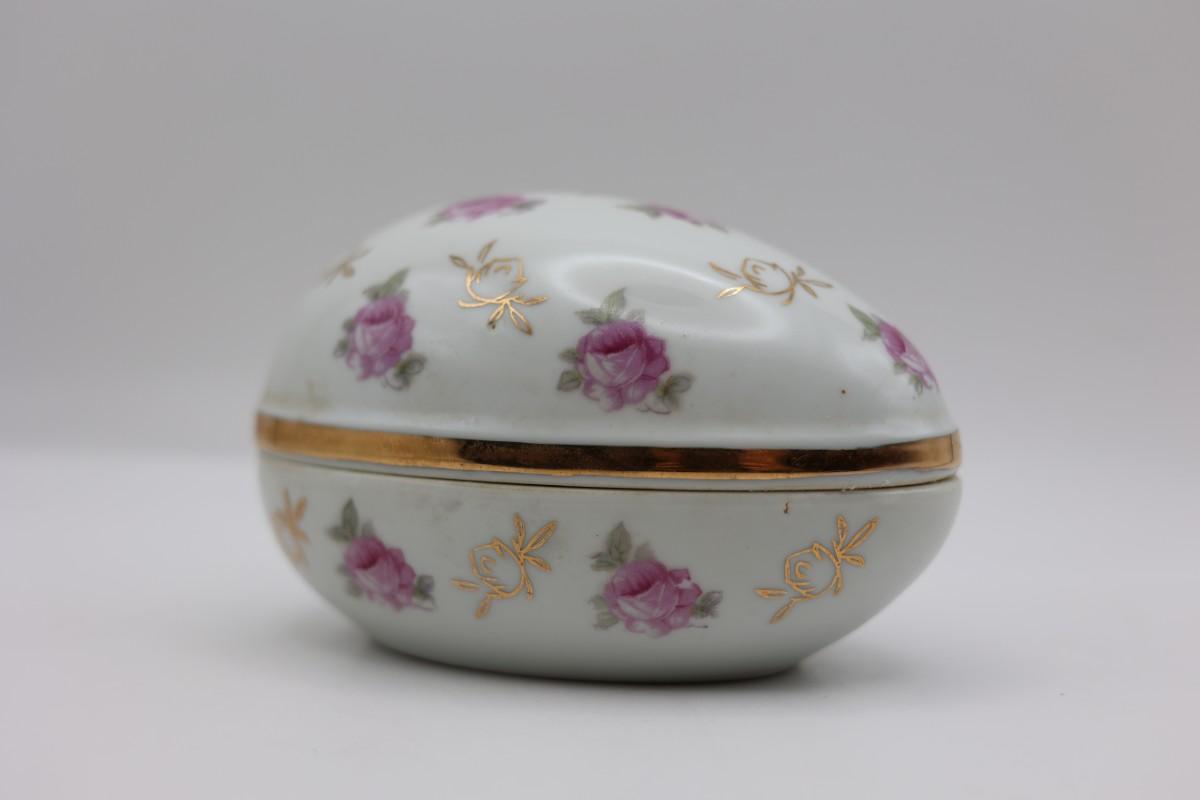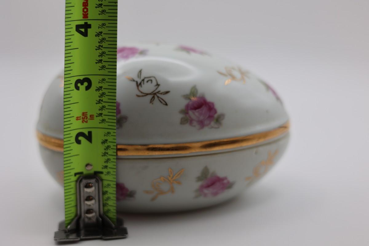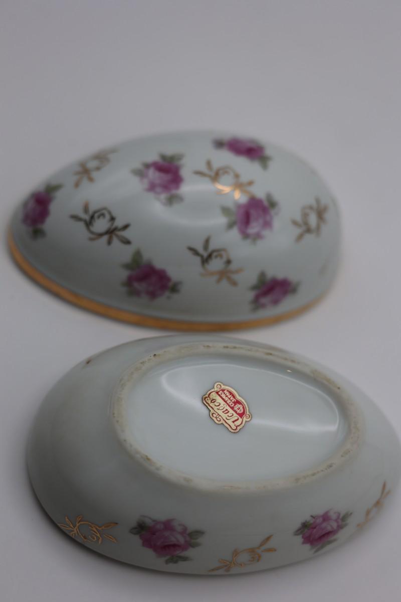 Porcelain trinket box by Ucagco (United China & Glass Co.), made in Japan. Decorated with pink roses and gold accents on a pale blue ground. Oval lidded form, suitable for jewelry or small keepsakes. Marked Ucagco / Japan on the underside.