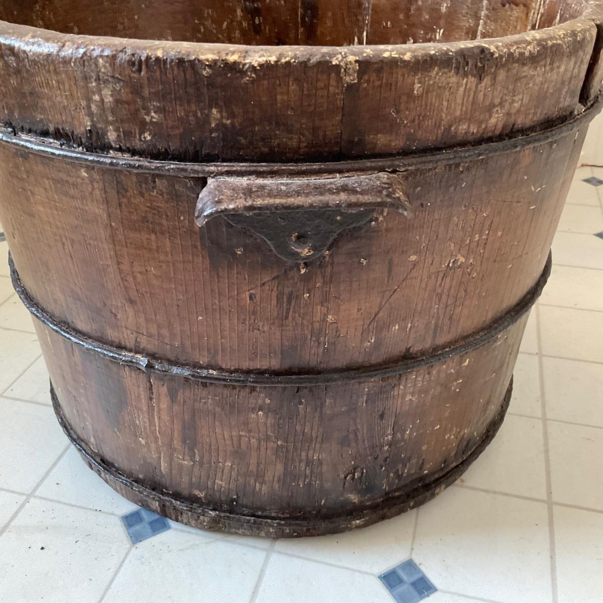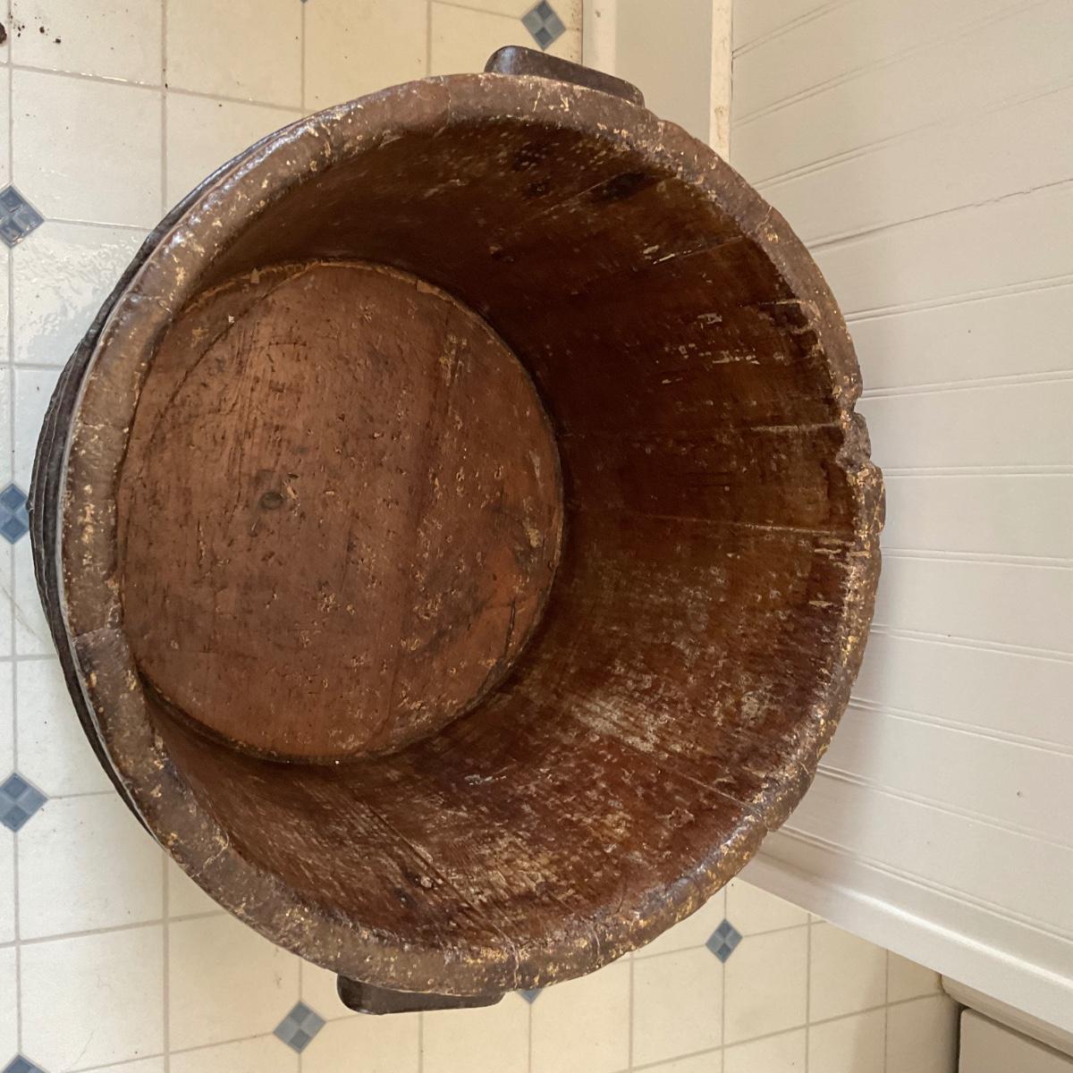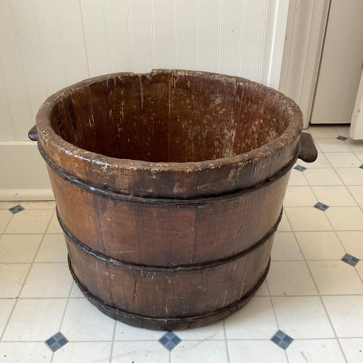 UD739 Antique Primitive Wooden Bucket with Wrought Iron Handles